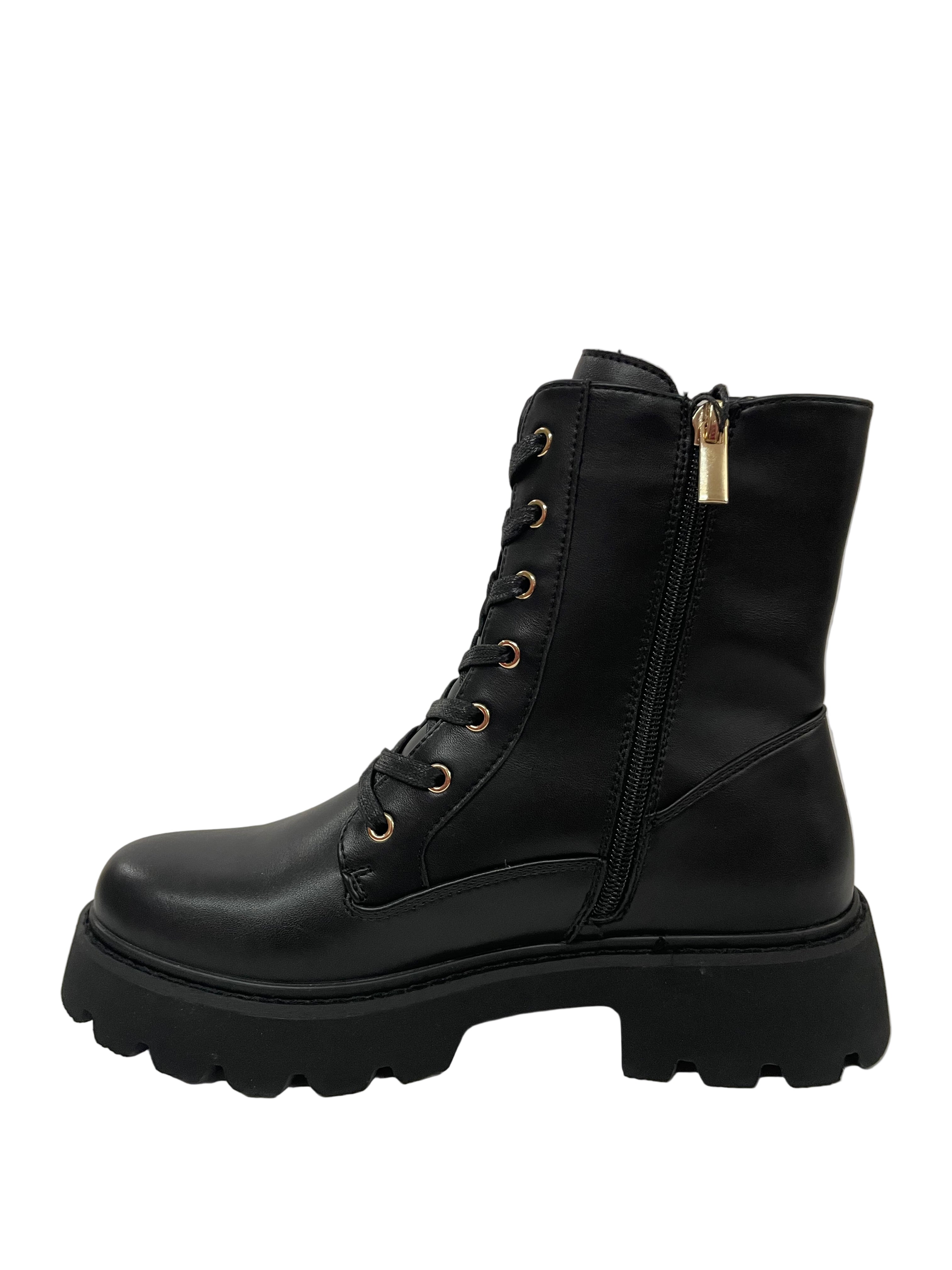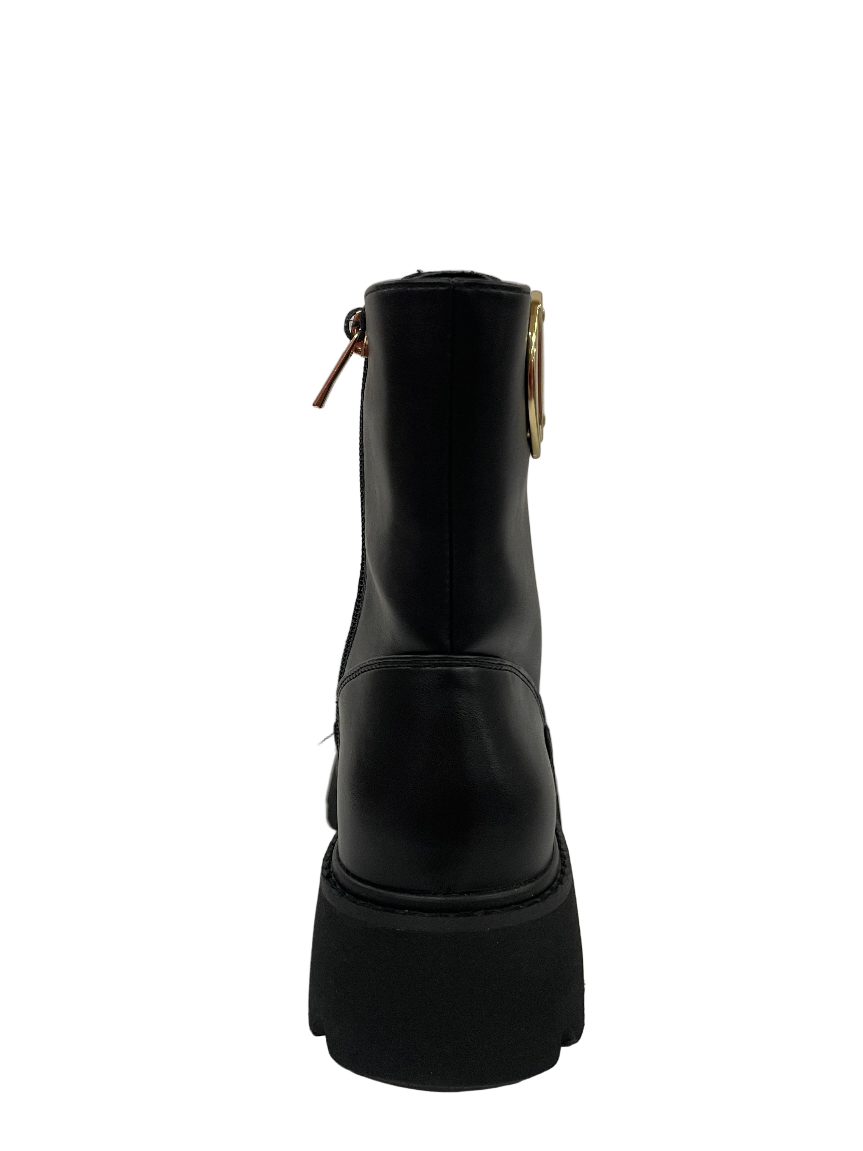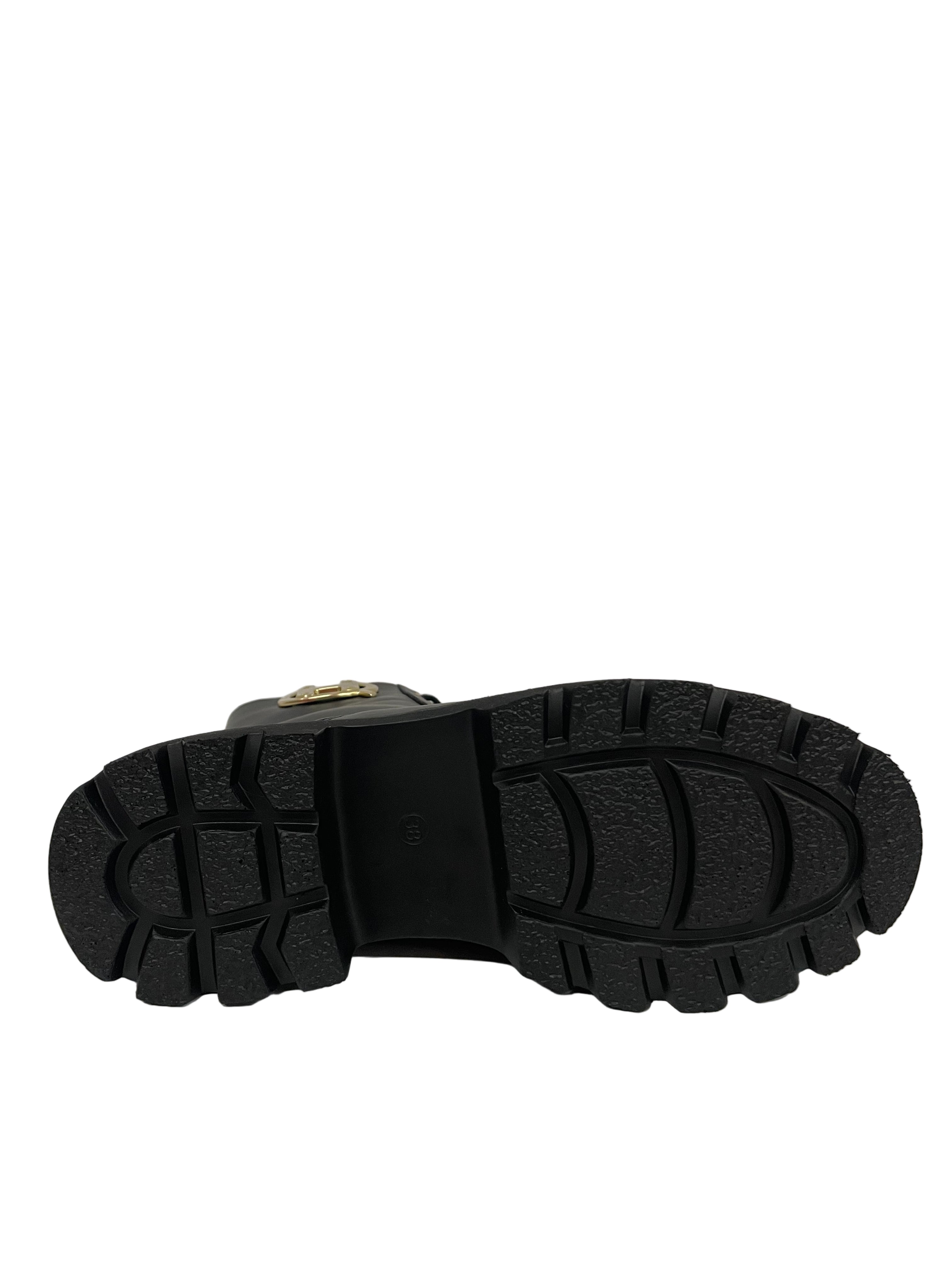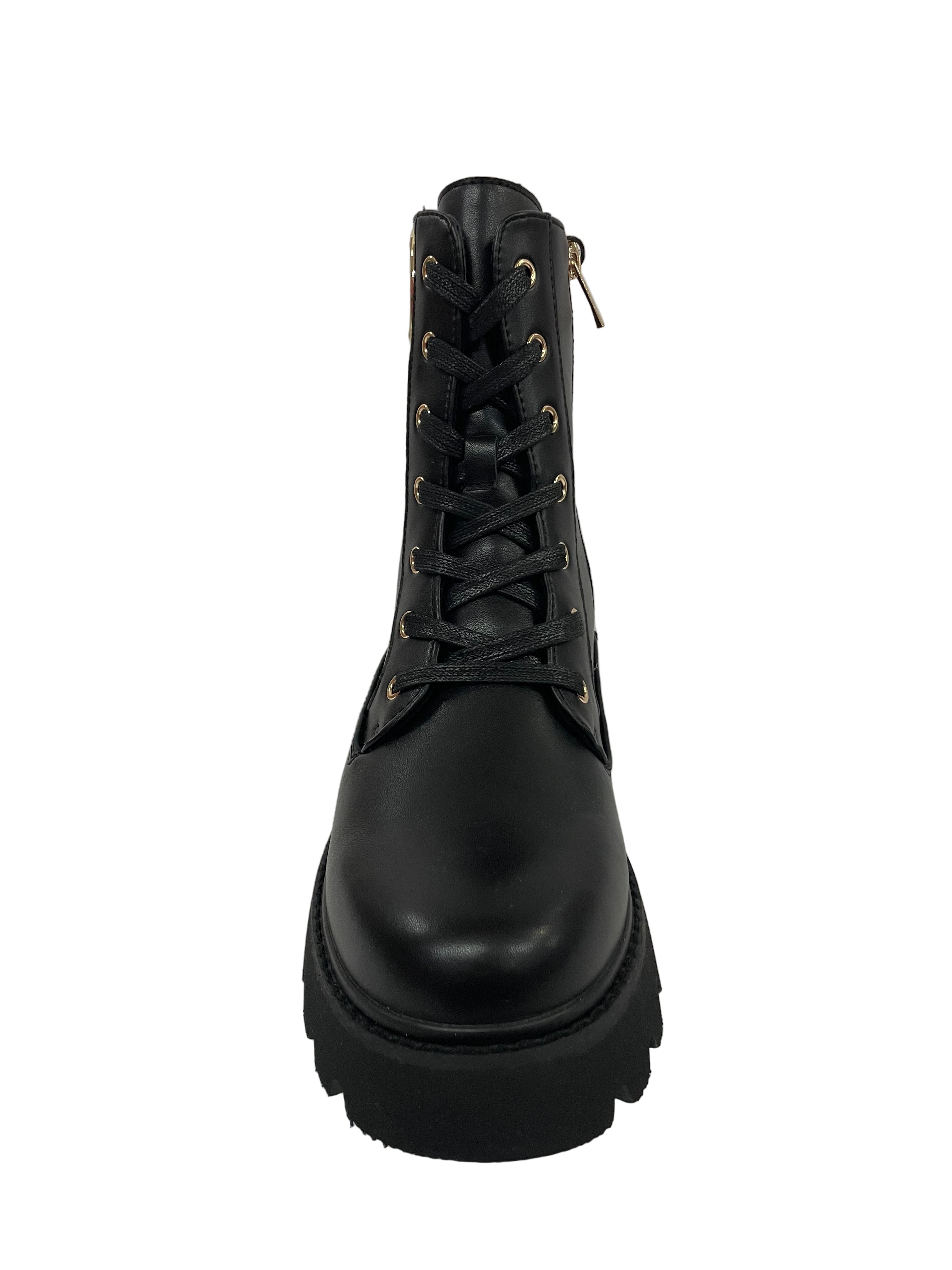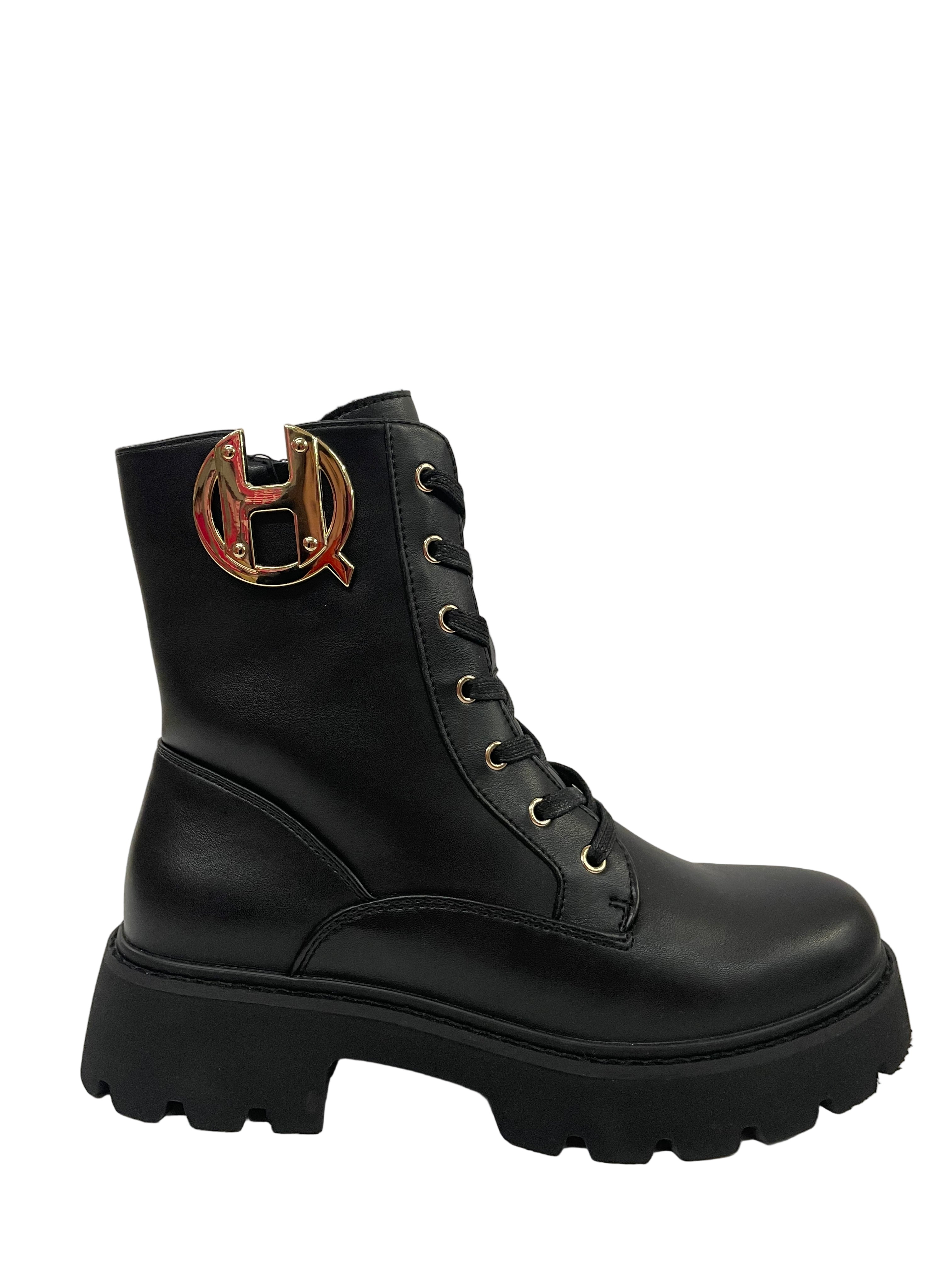 Occhielli Dorati a Contrasto: L'allacciatura frontale è accentuata da occhielli dorati che richiamano il metallo del logo, creando un elegante contrasto con il nero dello stivale.