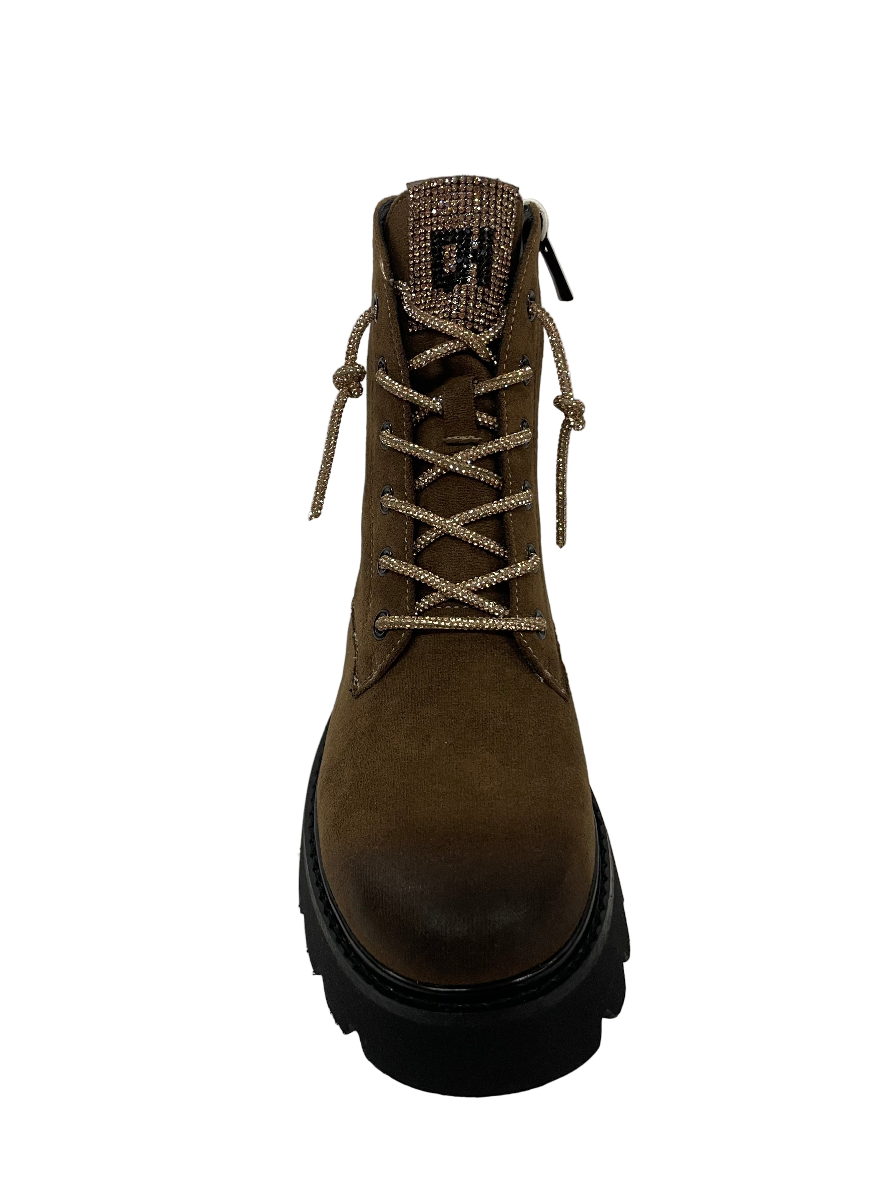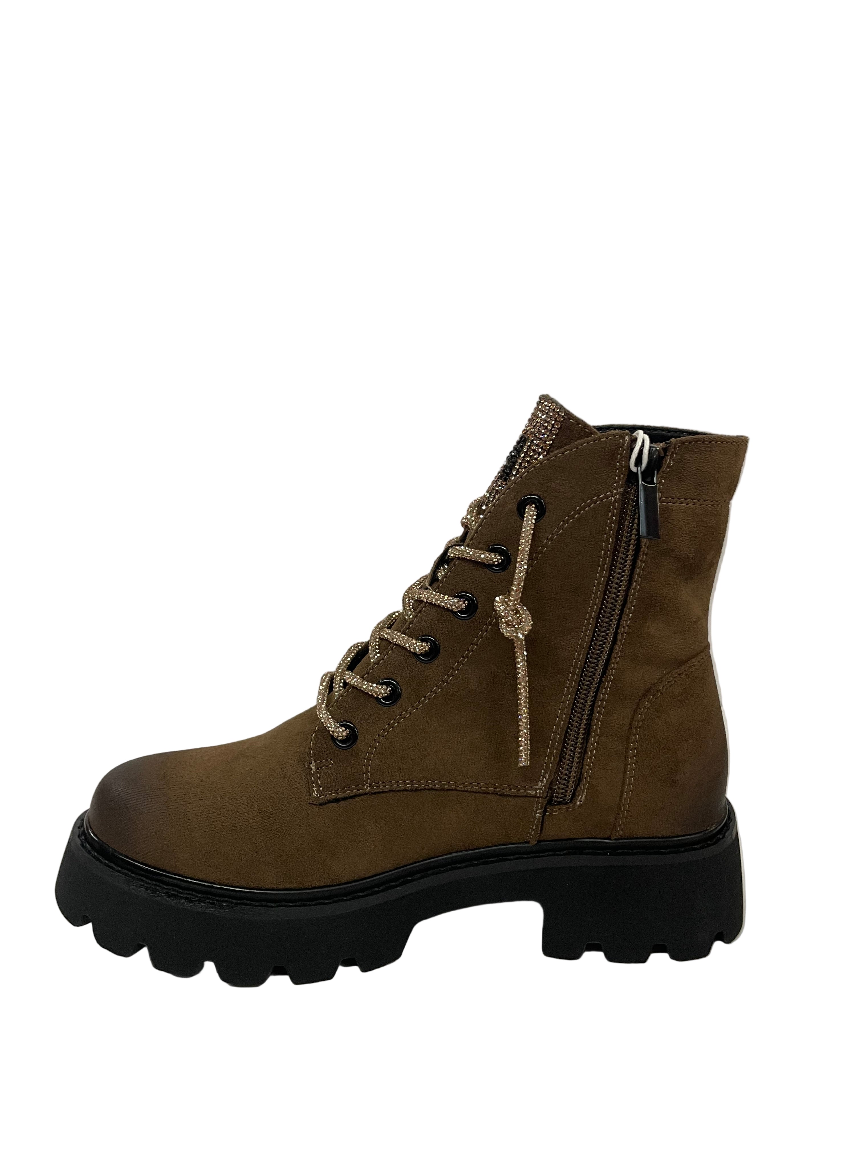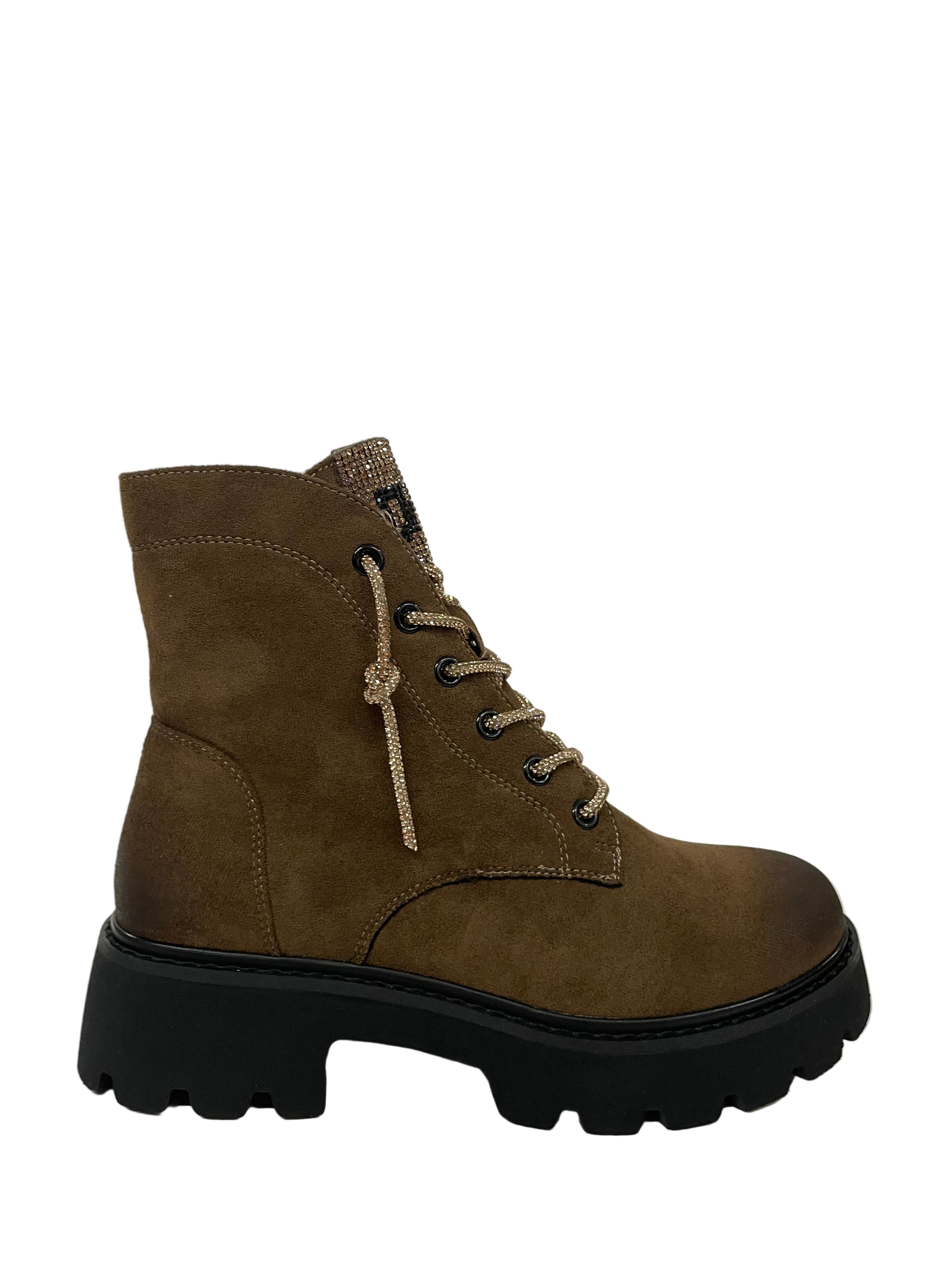 Dettaglio Glitterato sul Collarino: La parte superiore del gambale (collarino) è rivestita da una fascia di strass tono su tono (dorati/bronzo) che aggiunge un elemento di brillantezza inaspettato.