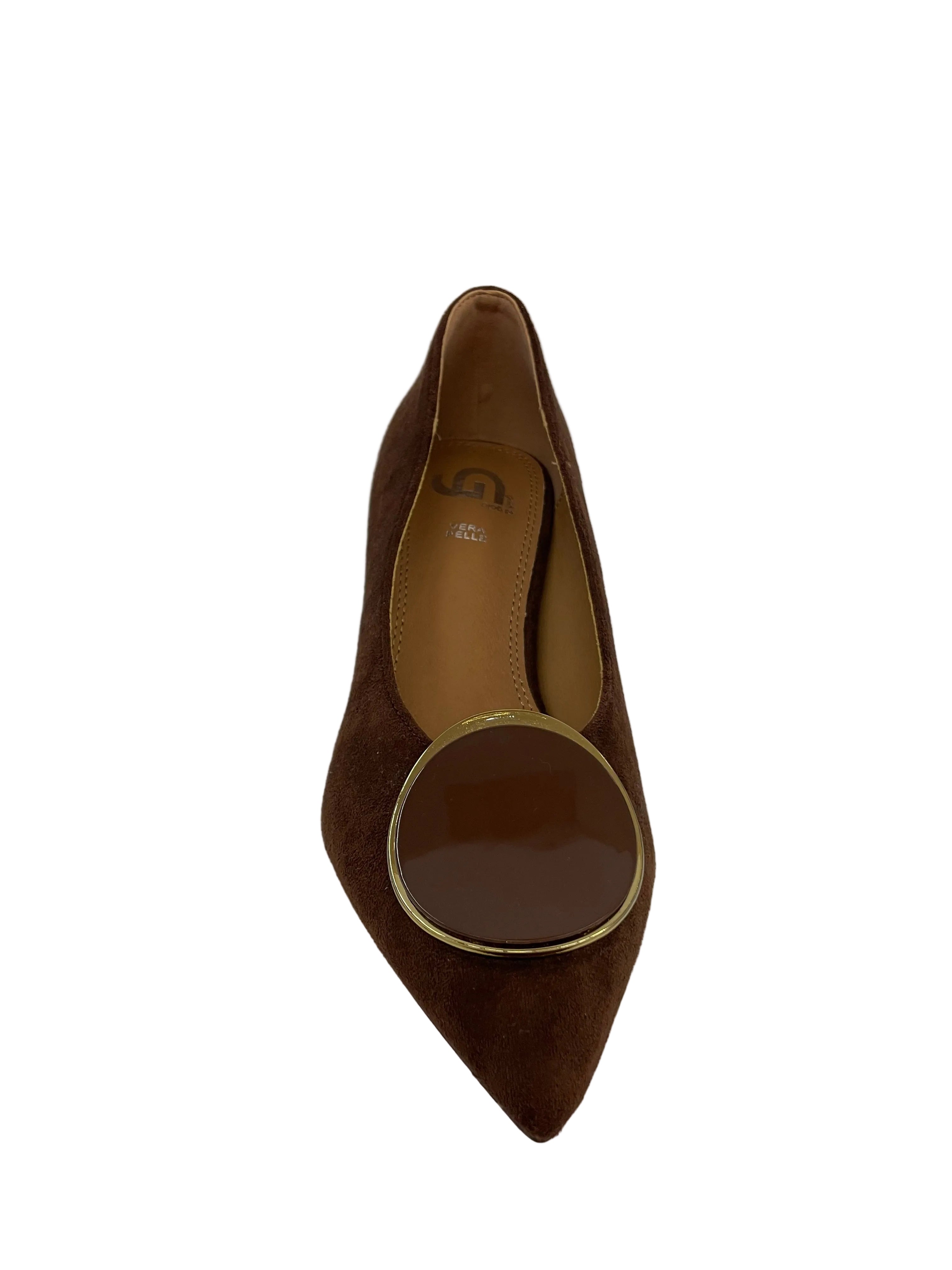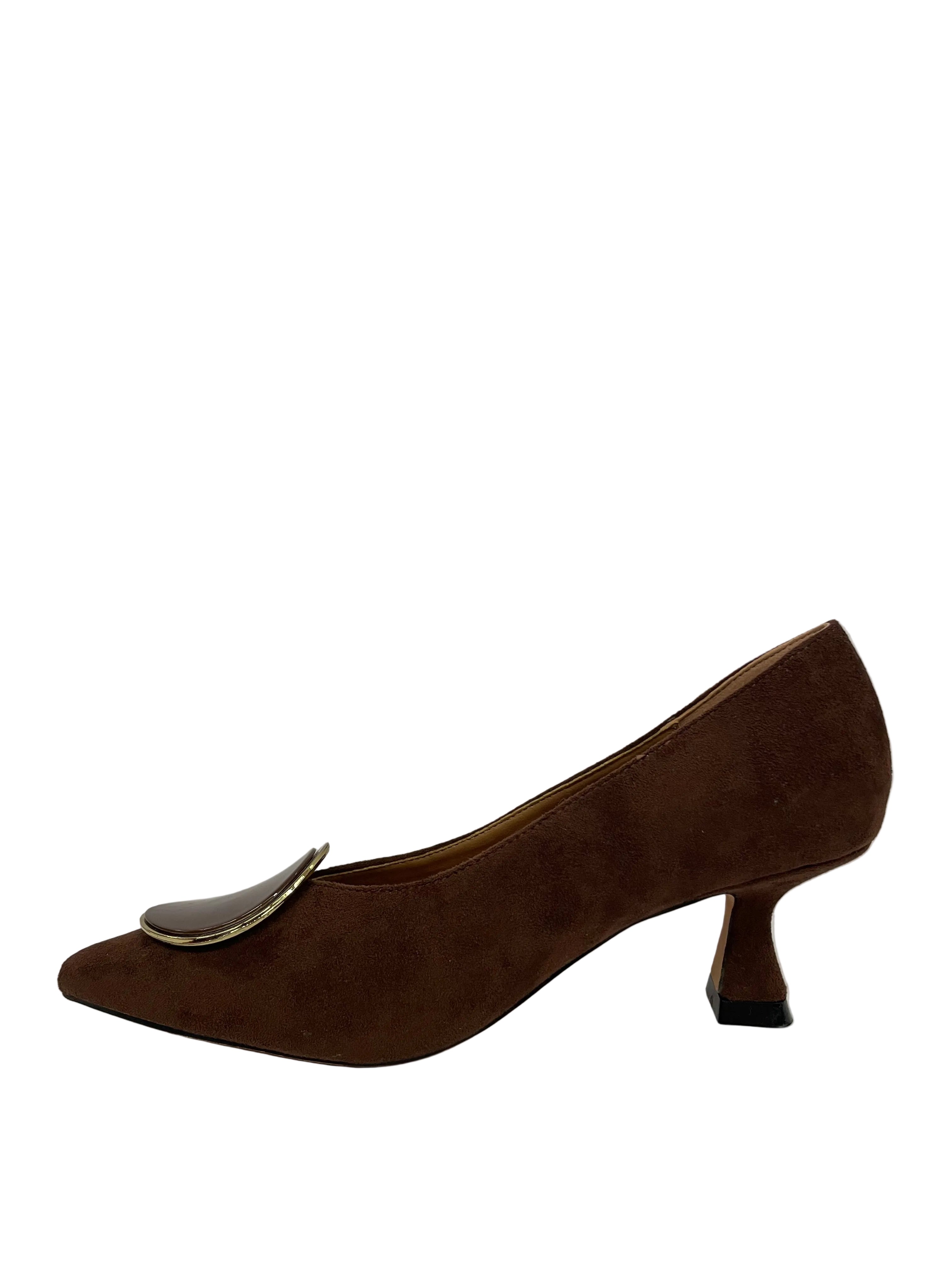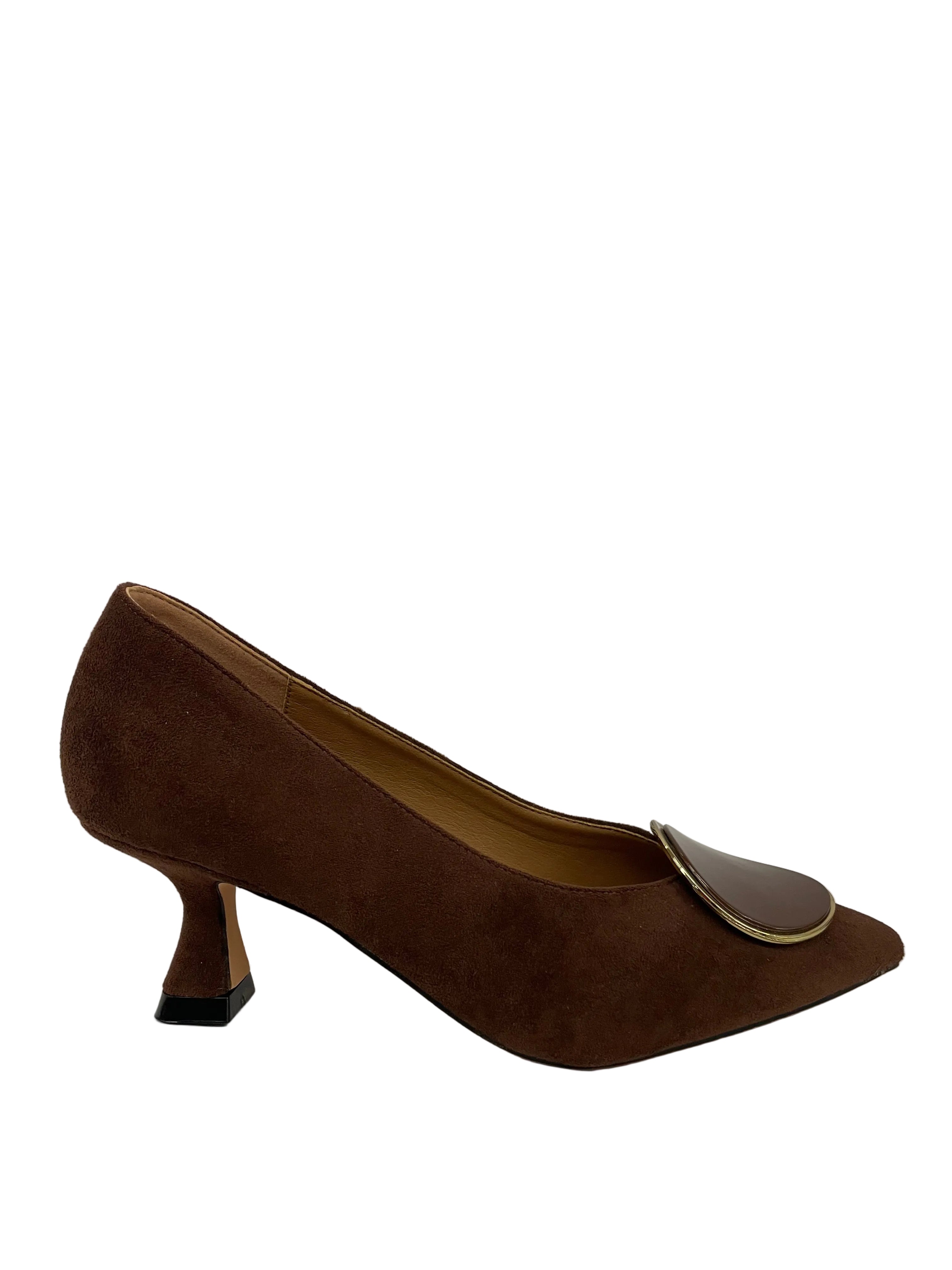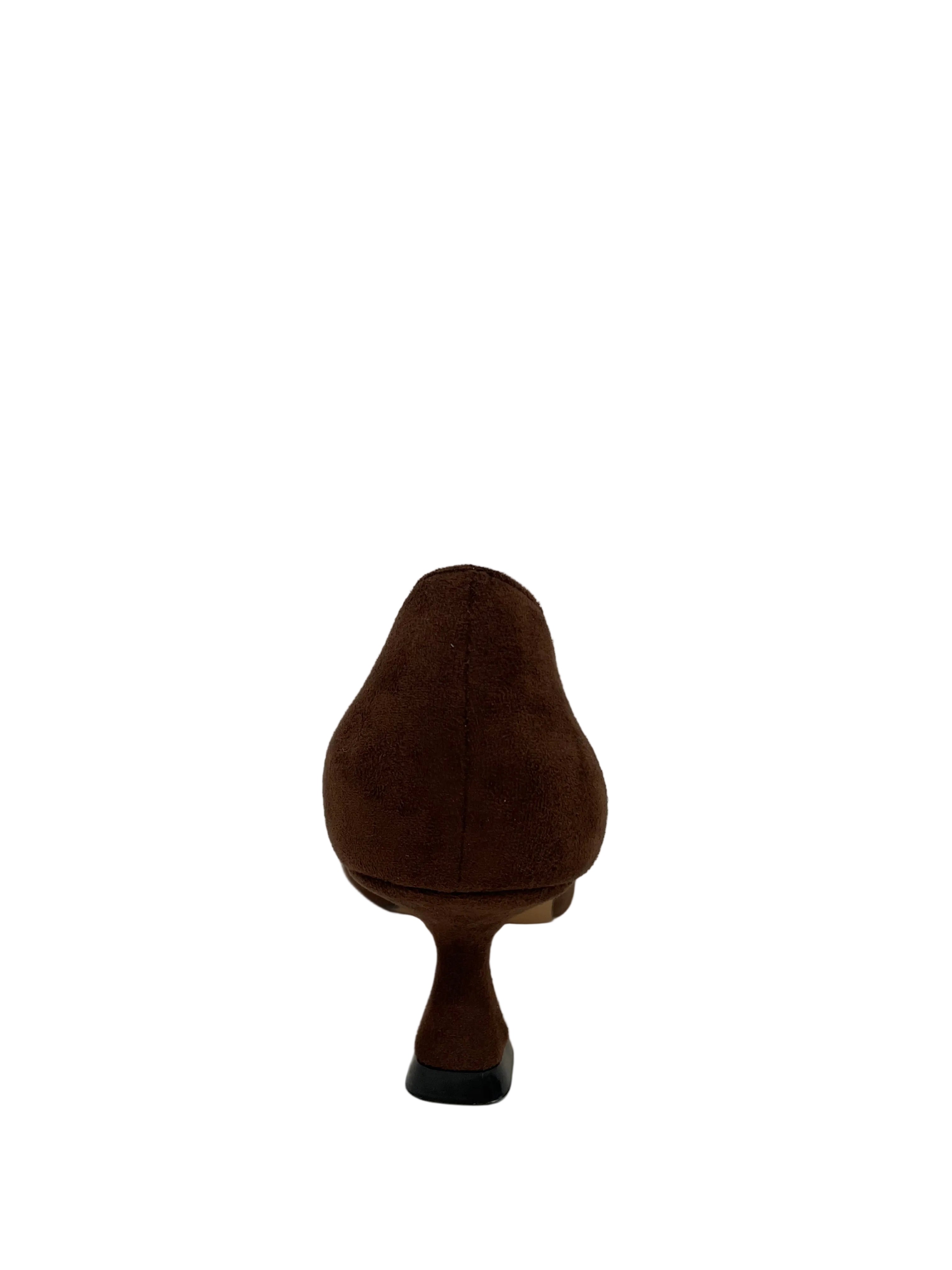 • Tonalità Calda: Un velluto suede color marrone cioccolato avvolge la silhouette affusolata, conferendo una sofisticata morbidezza.