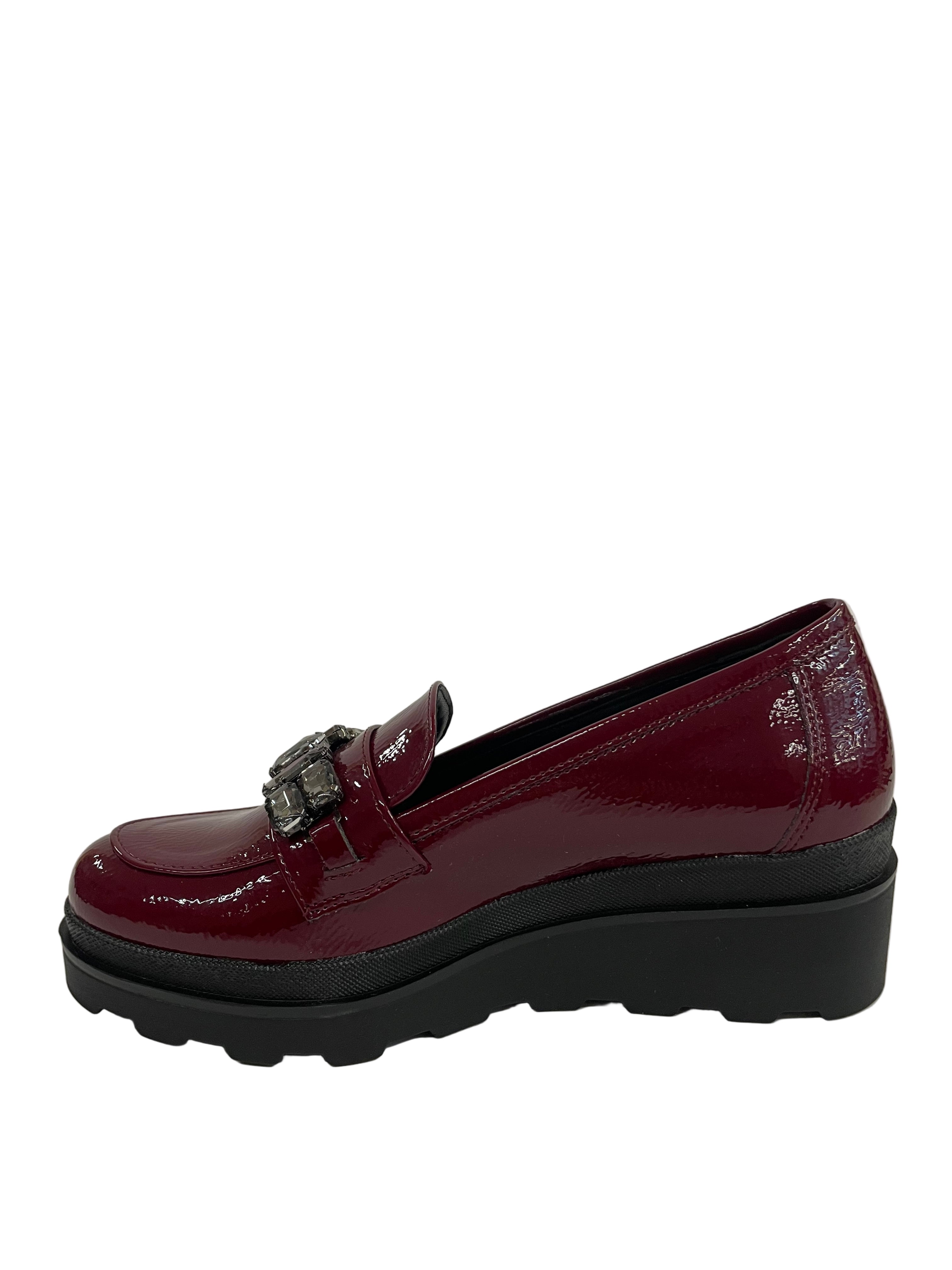 Unisce la vivacità del colore lucido alla praticità della zeppa, conferendo un tocco glamour ad ogni passo.