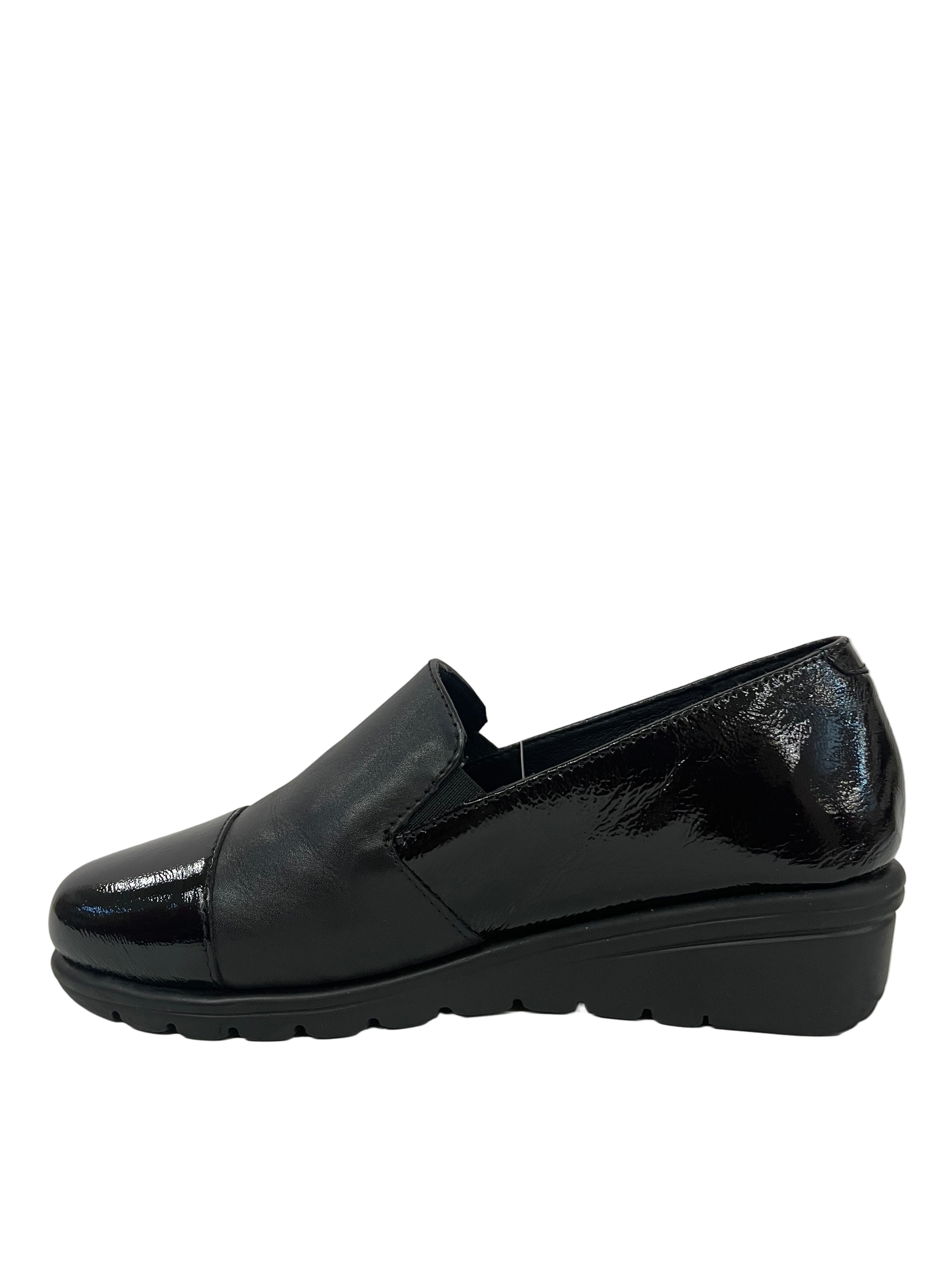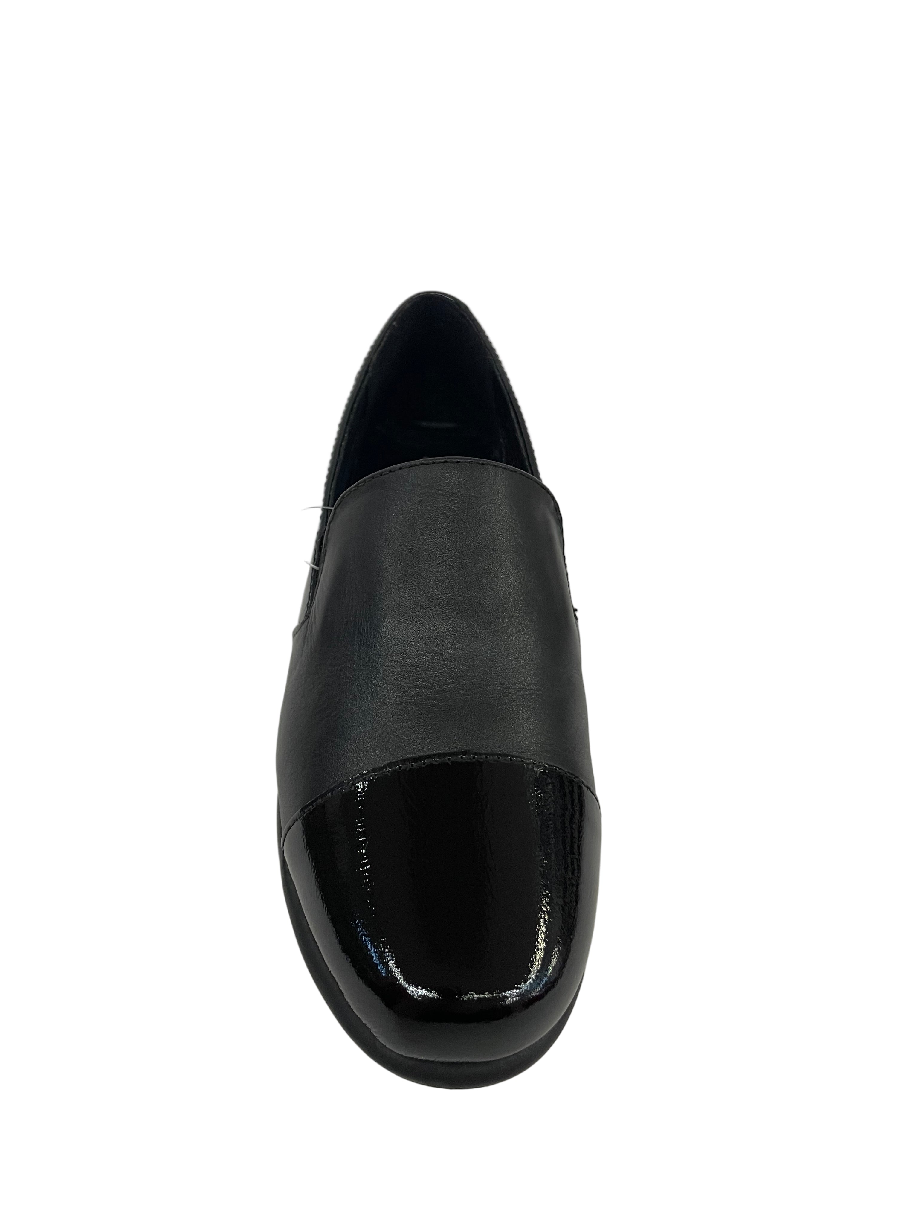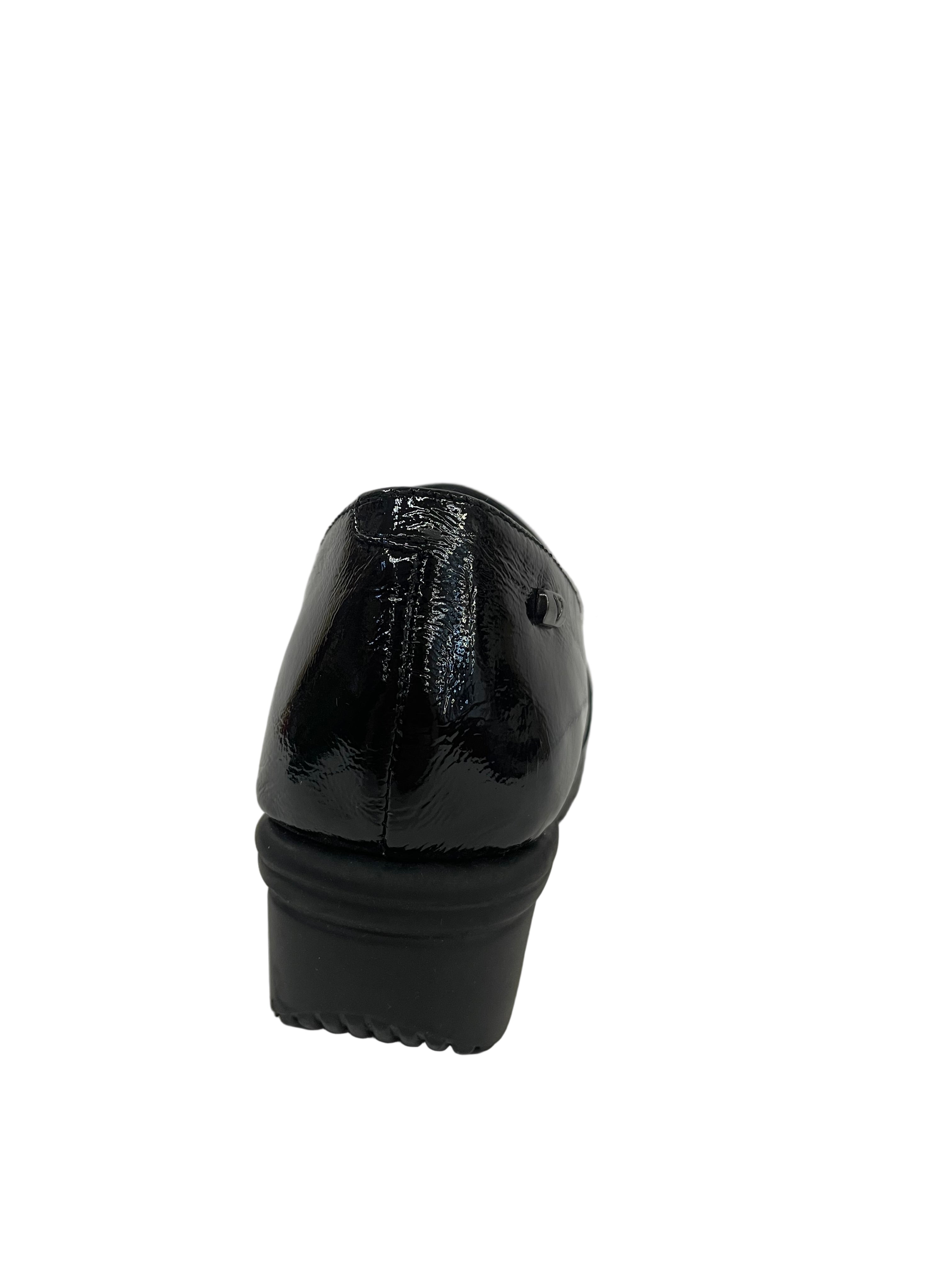 • Contrasti di Texture Lucide: La tomaia è definita dal gioco di tre materiali neri: il pannello centrale e il puntale sono in vernice lucida a specchio, mentre la sezione centrale sul collo del piede è realizzata in morbida pelle liscia opaca.