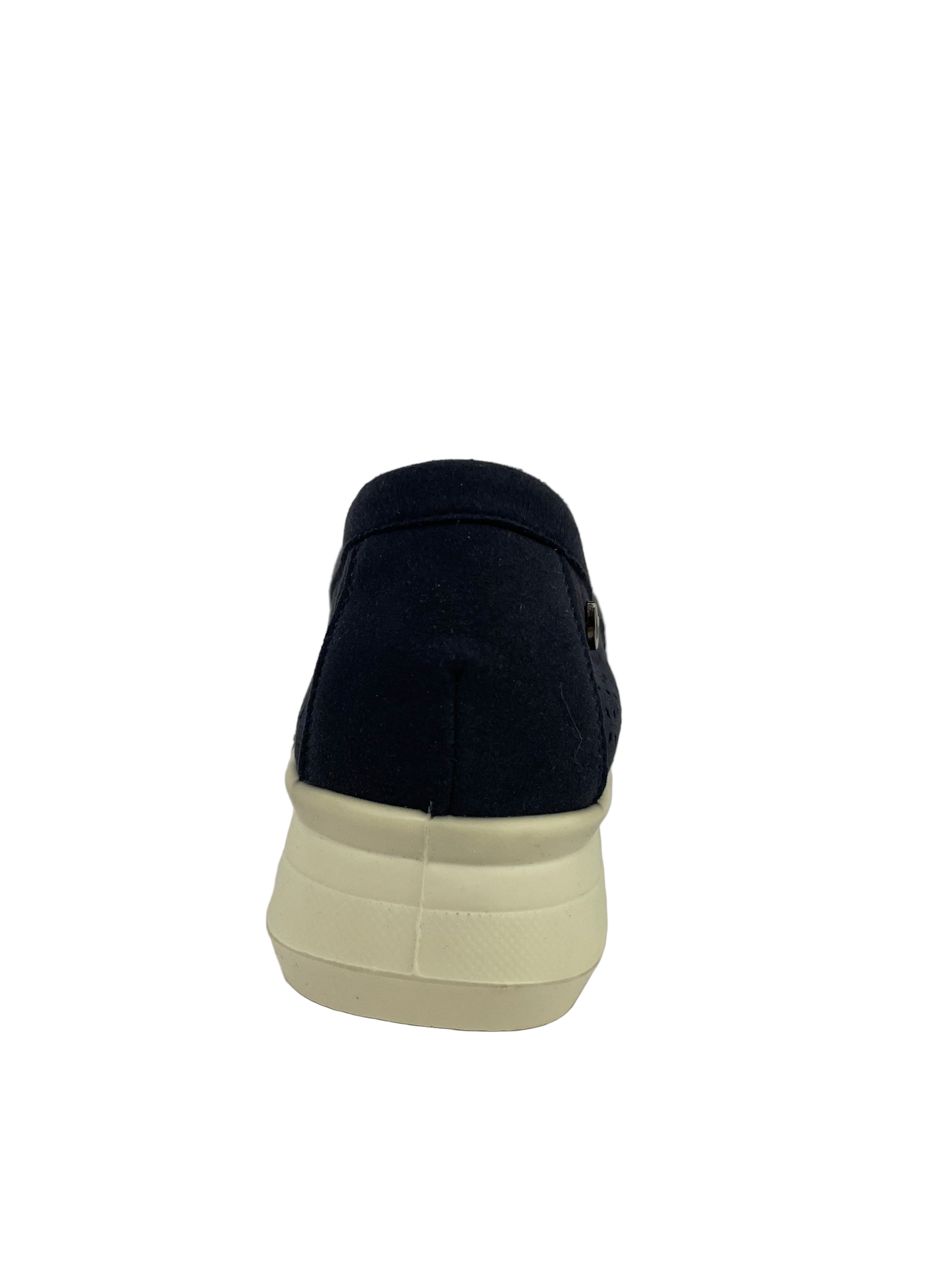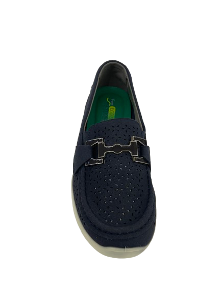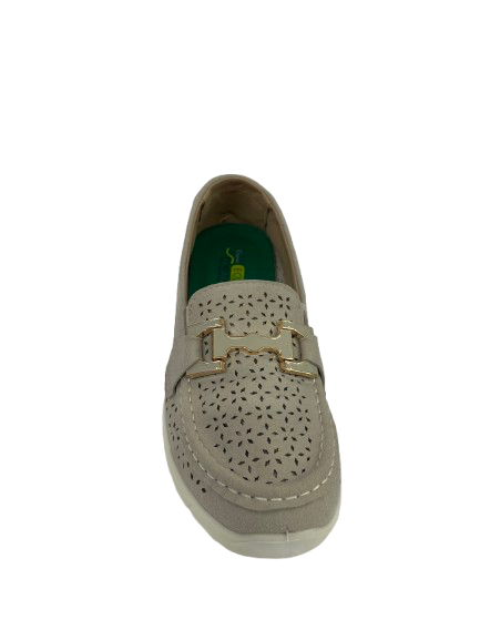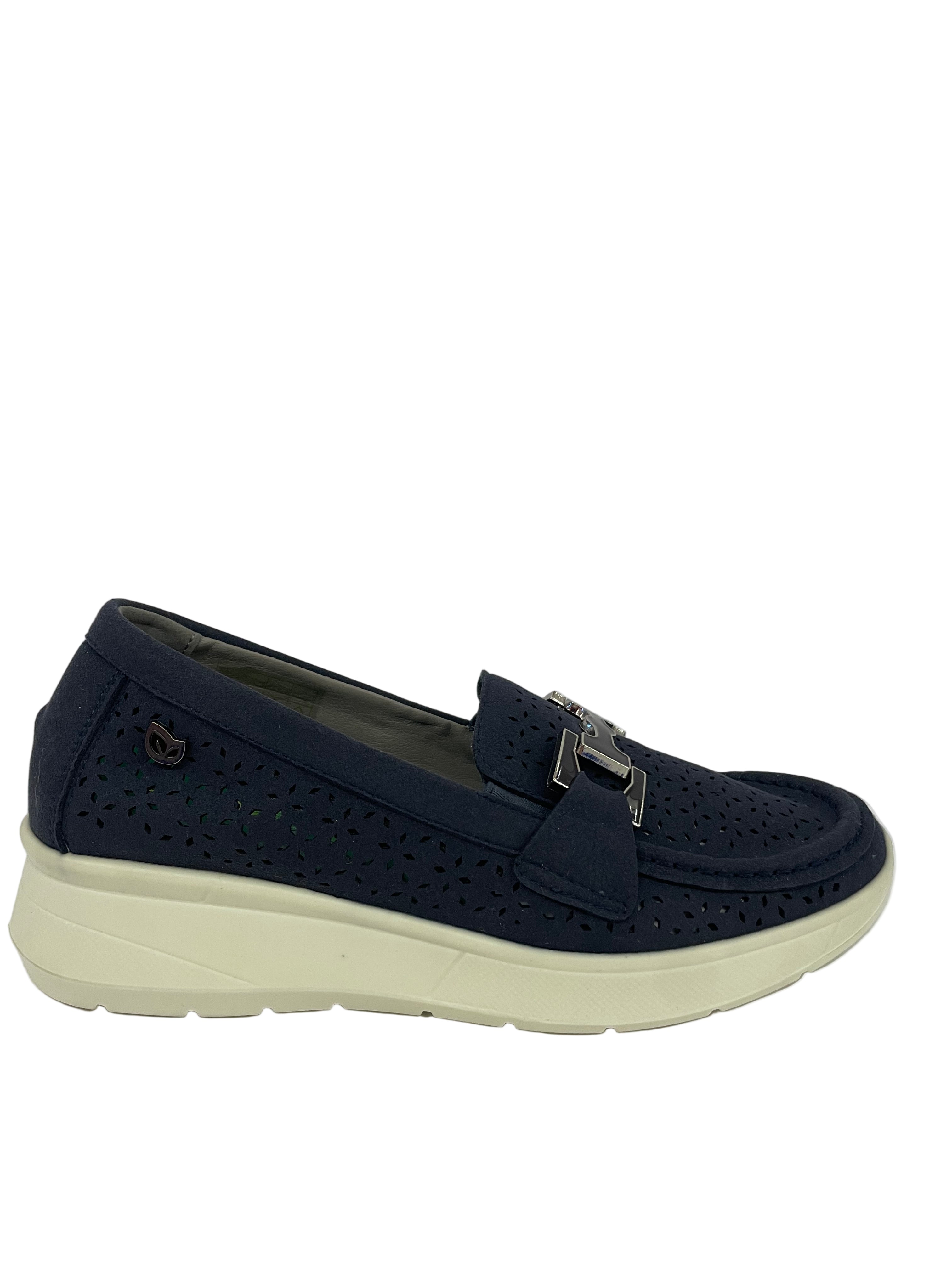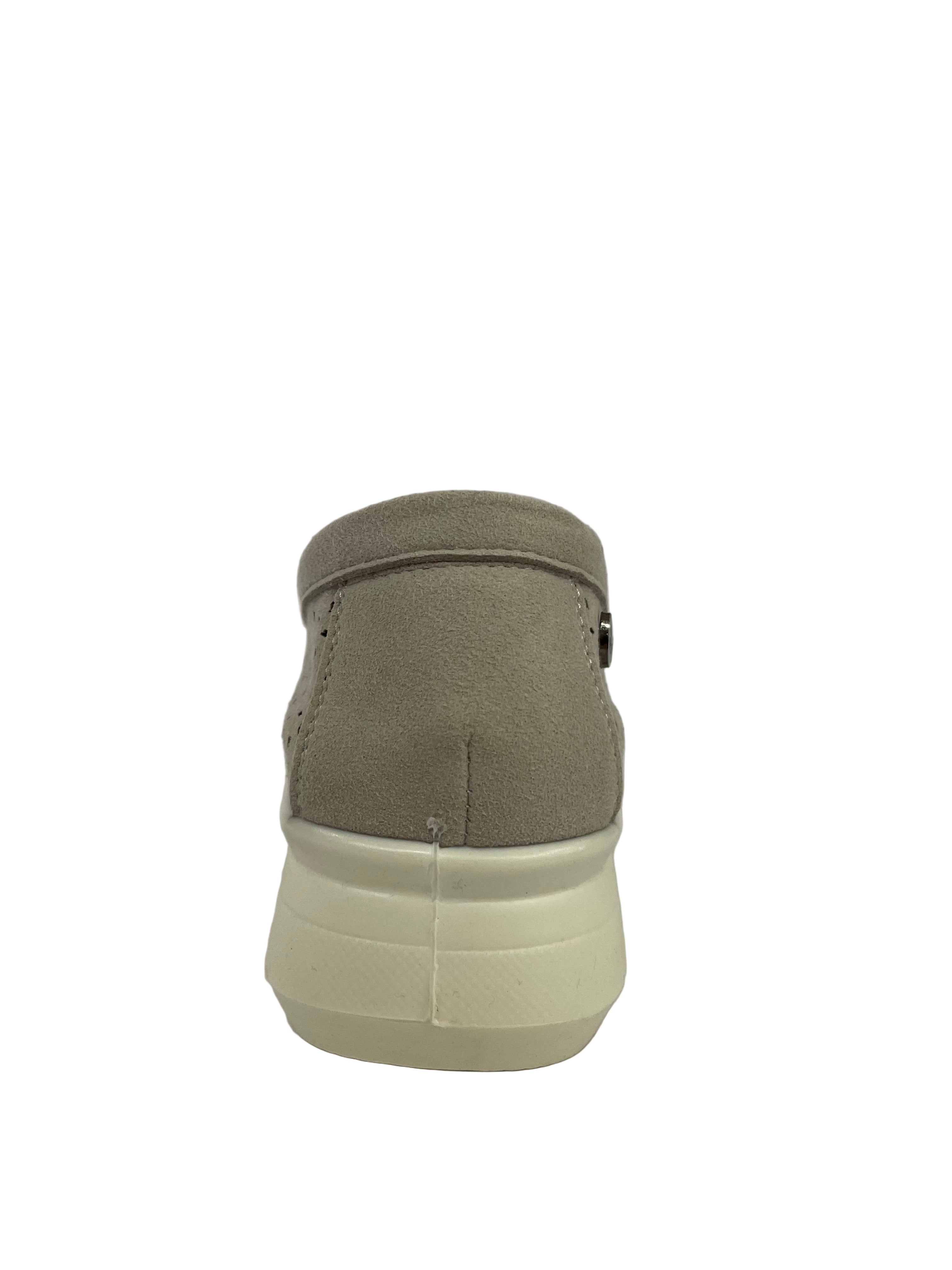 Pelle Scamosciata e Traforata: Realizzato in morbida pelle scamosciata ecologica, questo mocassino presenta una lavorazione traforata (bucarellata) a motivo floreale geometrico su tutta la tomaia.