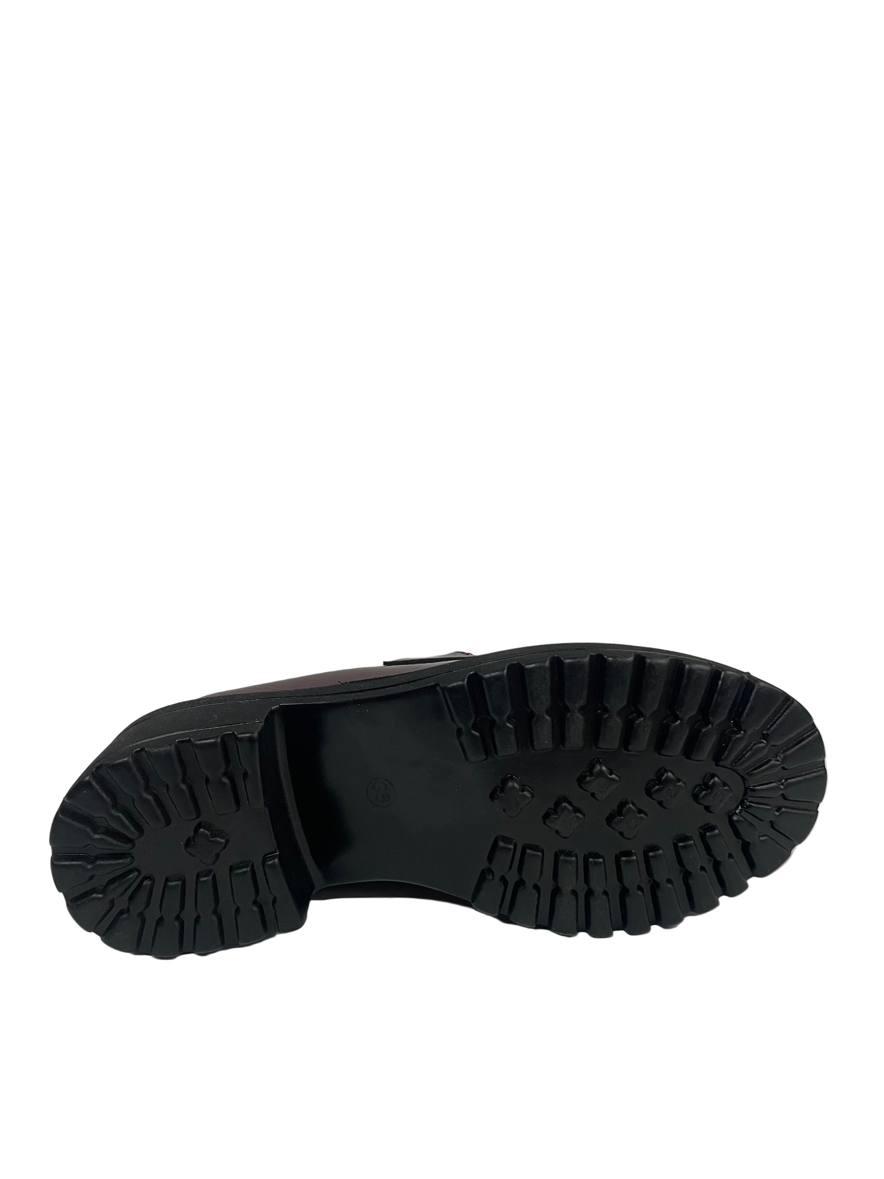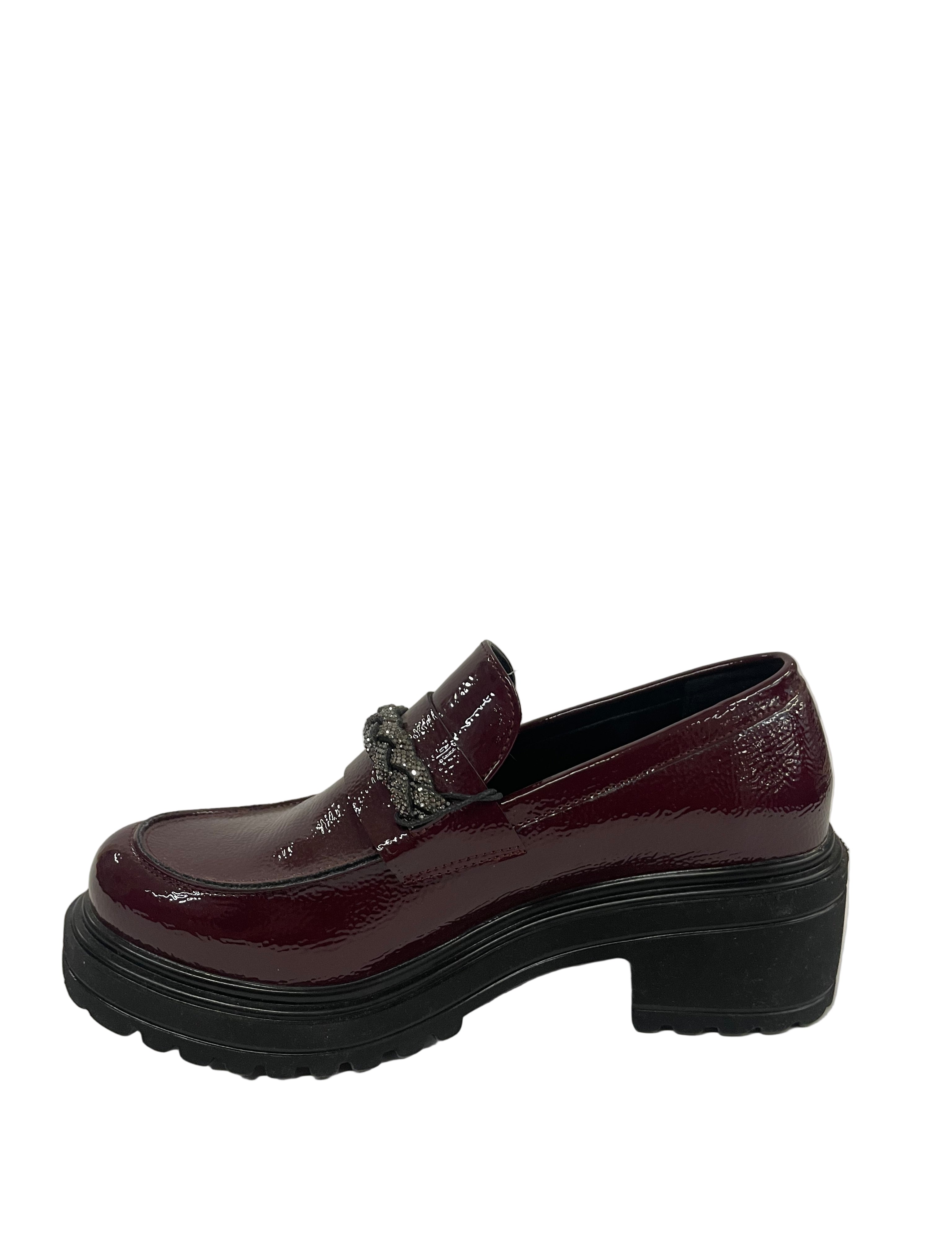 Colore e Finitura Unici: Mocassino dal forte impatto visivo, realizzato in ecopelle verniciata color bordeaux/vinaccia, che aggiunge profondità e un tocco di colore distintivo.