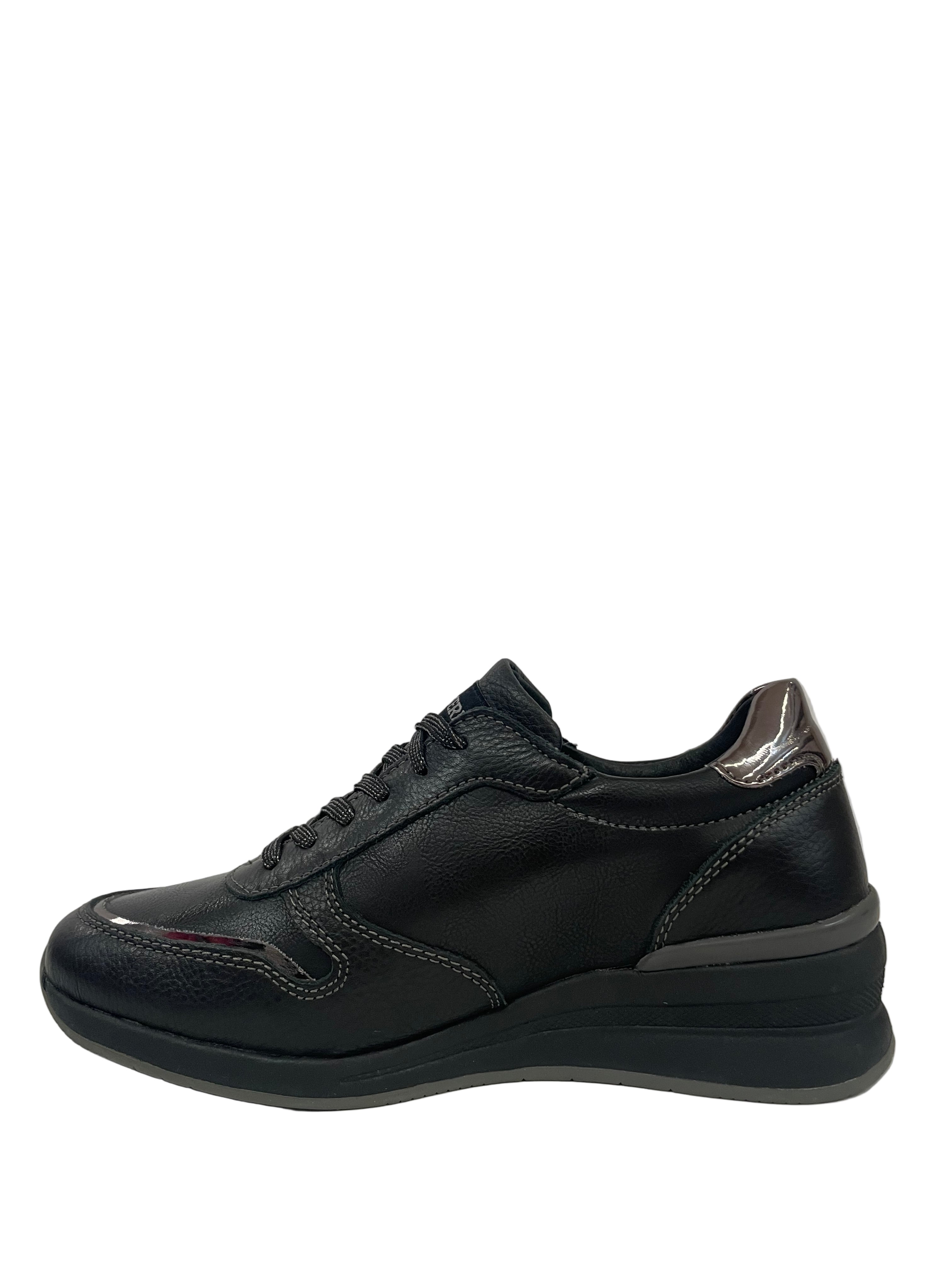 Una sneaker essenziale che non rinuncia all'eleganza. Realizzata in morbida pelle nera martellata, offre un comfort superiore grazie alla calzata Valleverde. Il design è impreziosito da discreti ma sofisticati inserti in metallo lucido sul tallone e sulla punta, che aggiungono un tocco moderno e ricercato. Perfetta per chi desidera una scarpa versatile, adatta sia al tempo libero che a occasioni più curate.