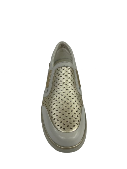 • Traspirabilità e Stile: La sezione centrale color oro è caratterizzata da un motivo traforato (perforato), che non solo aggiunge un dettaglio di design moderno, ma assicura anche la massima traspirabilità e comfort.