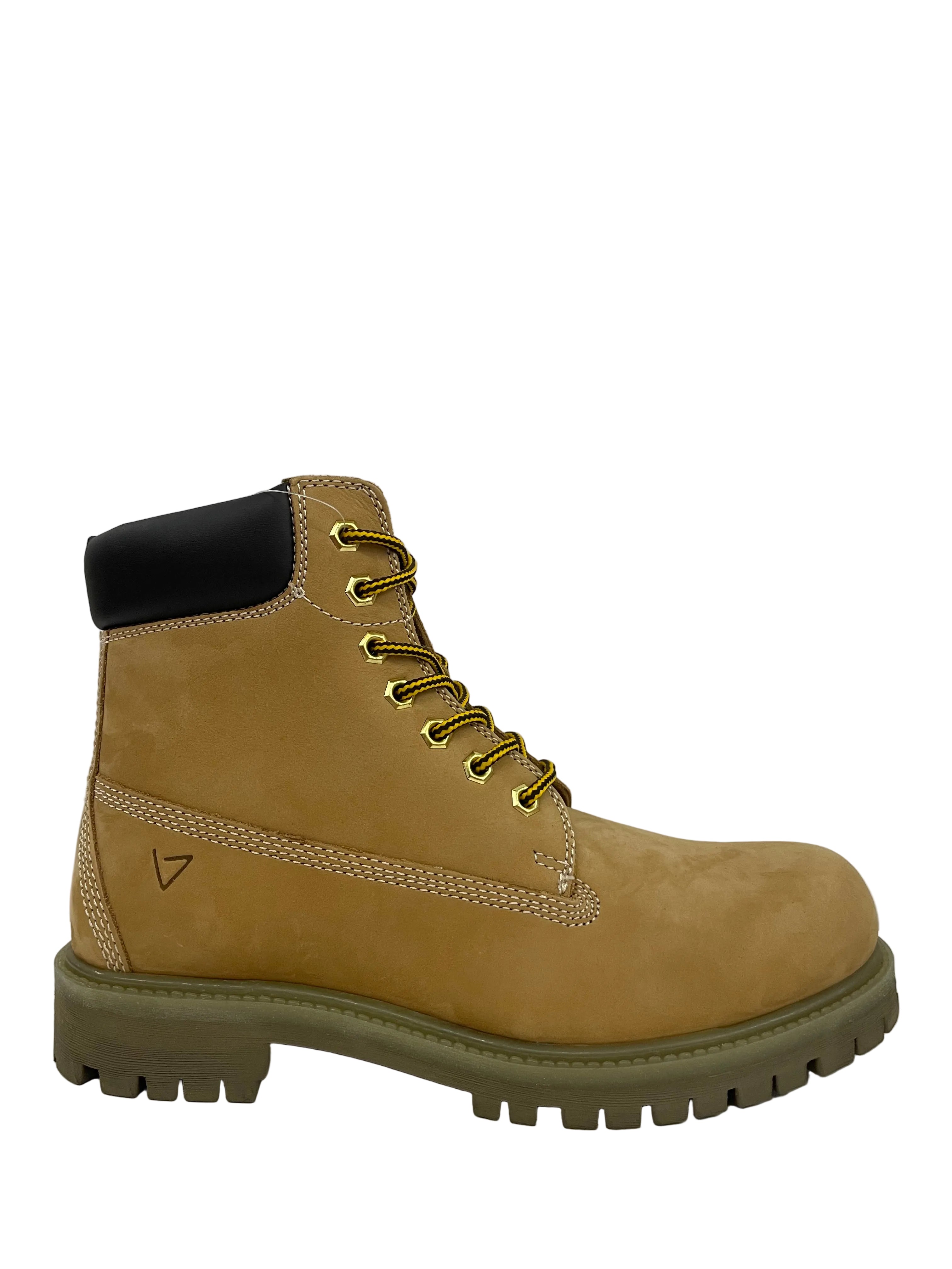 Realizzato in pelle nabuk color ocra, si distingue per la sua struttura robusta e la qualità dei materiali. La chiusura con lacci e ganci metallici garantisce una calzata sicura e personalizzata, mentre il collarino imbottito assicura sostegno e comfort alla caviglia.