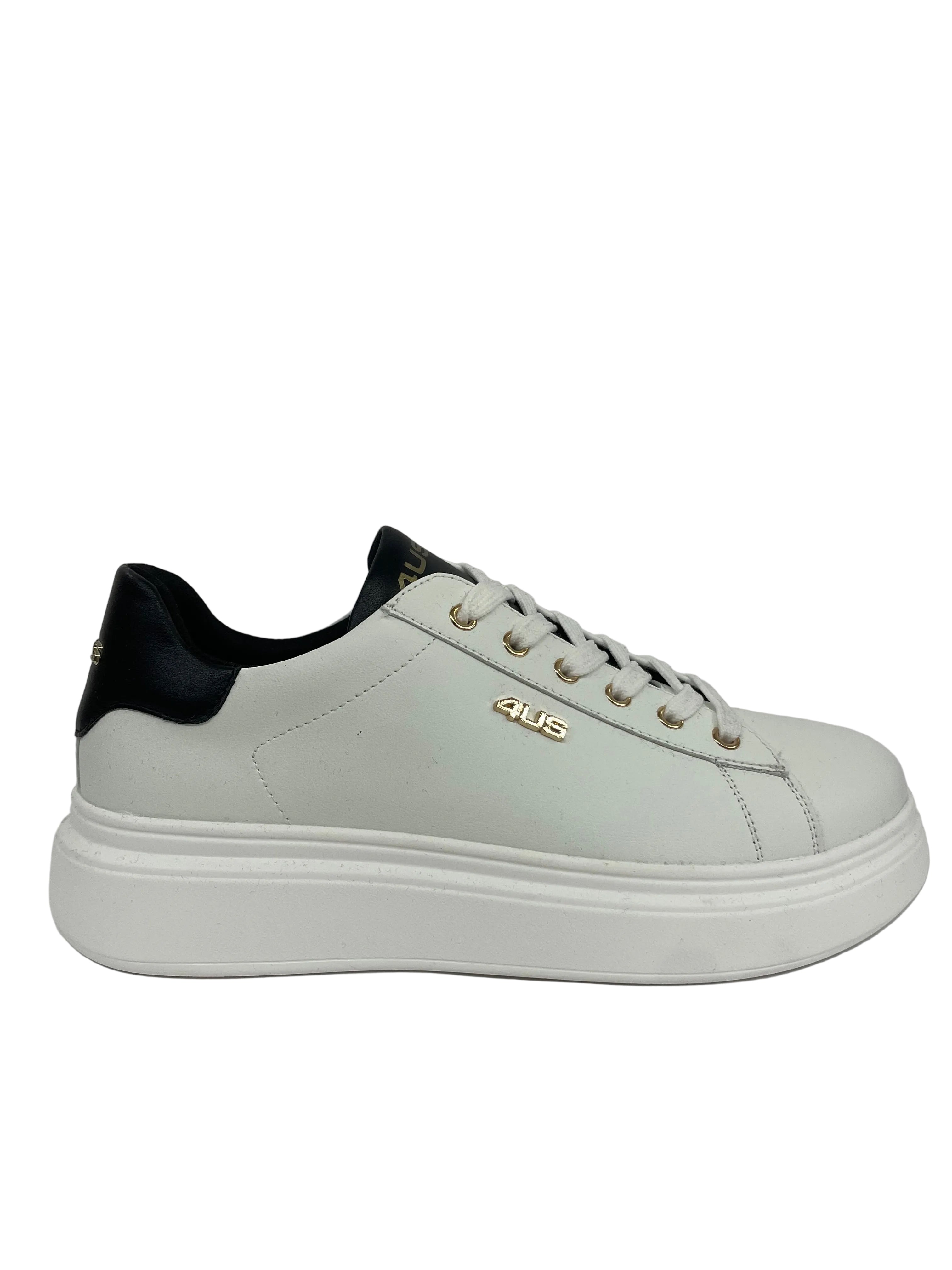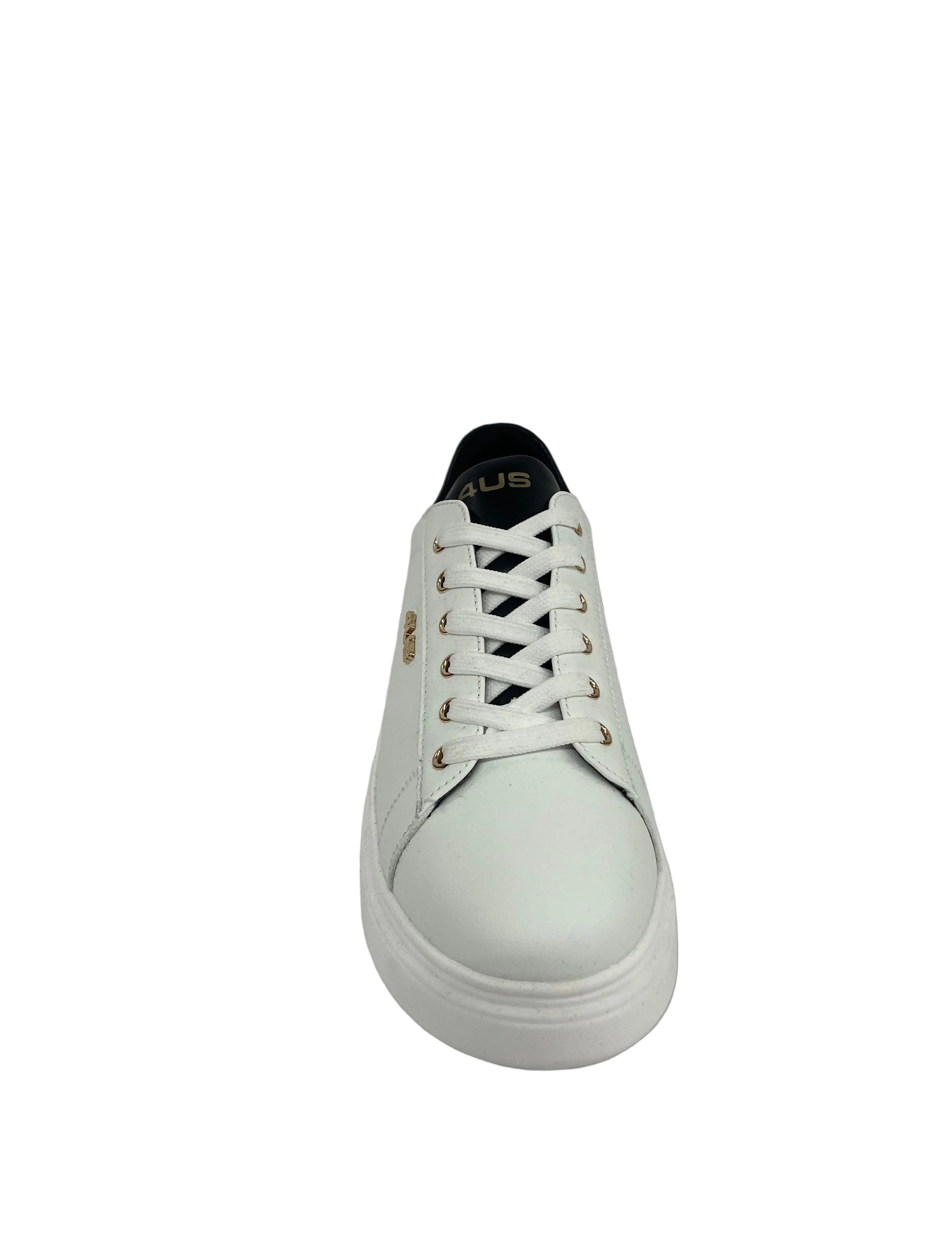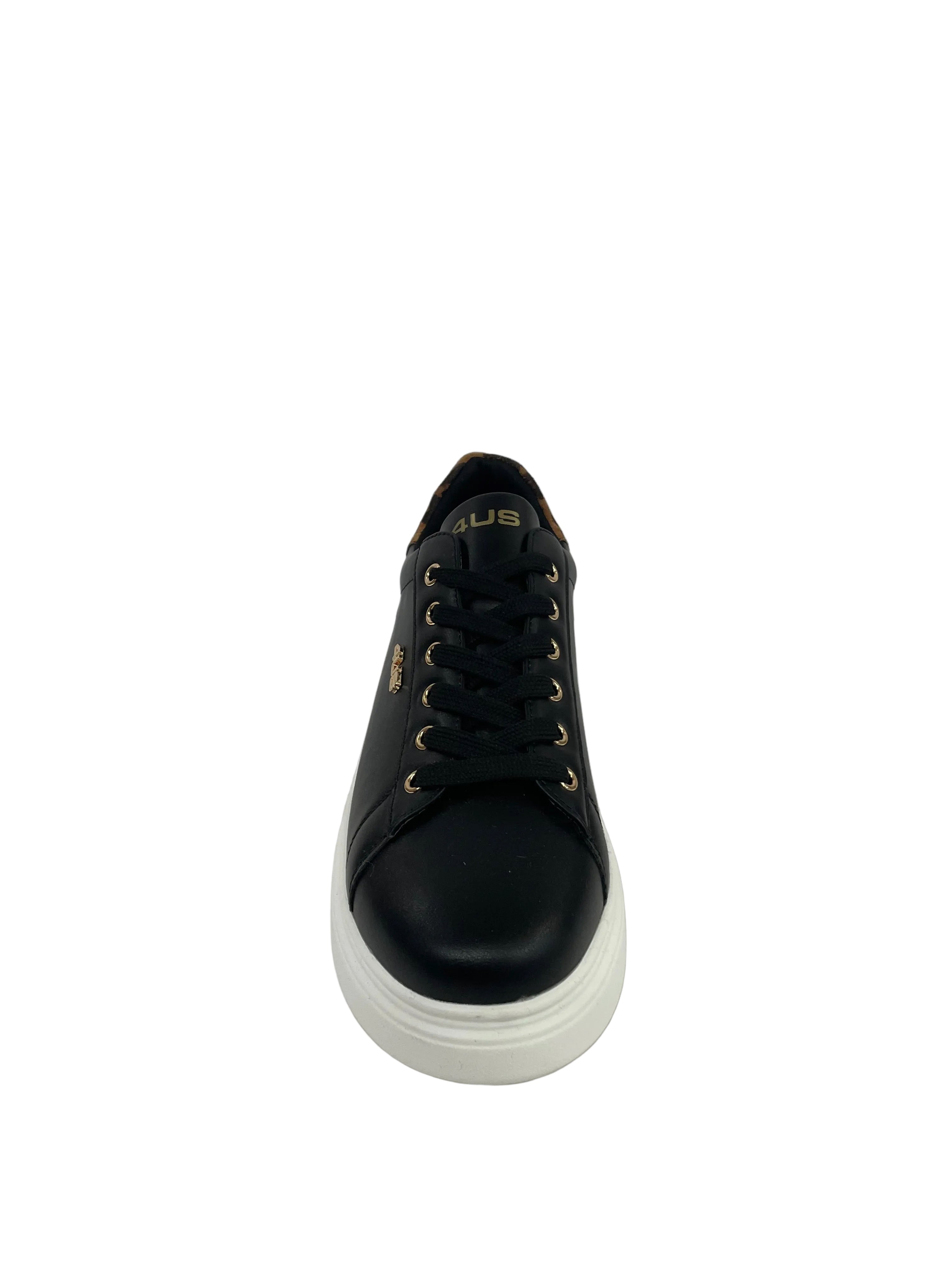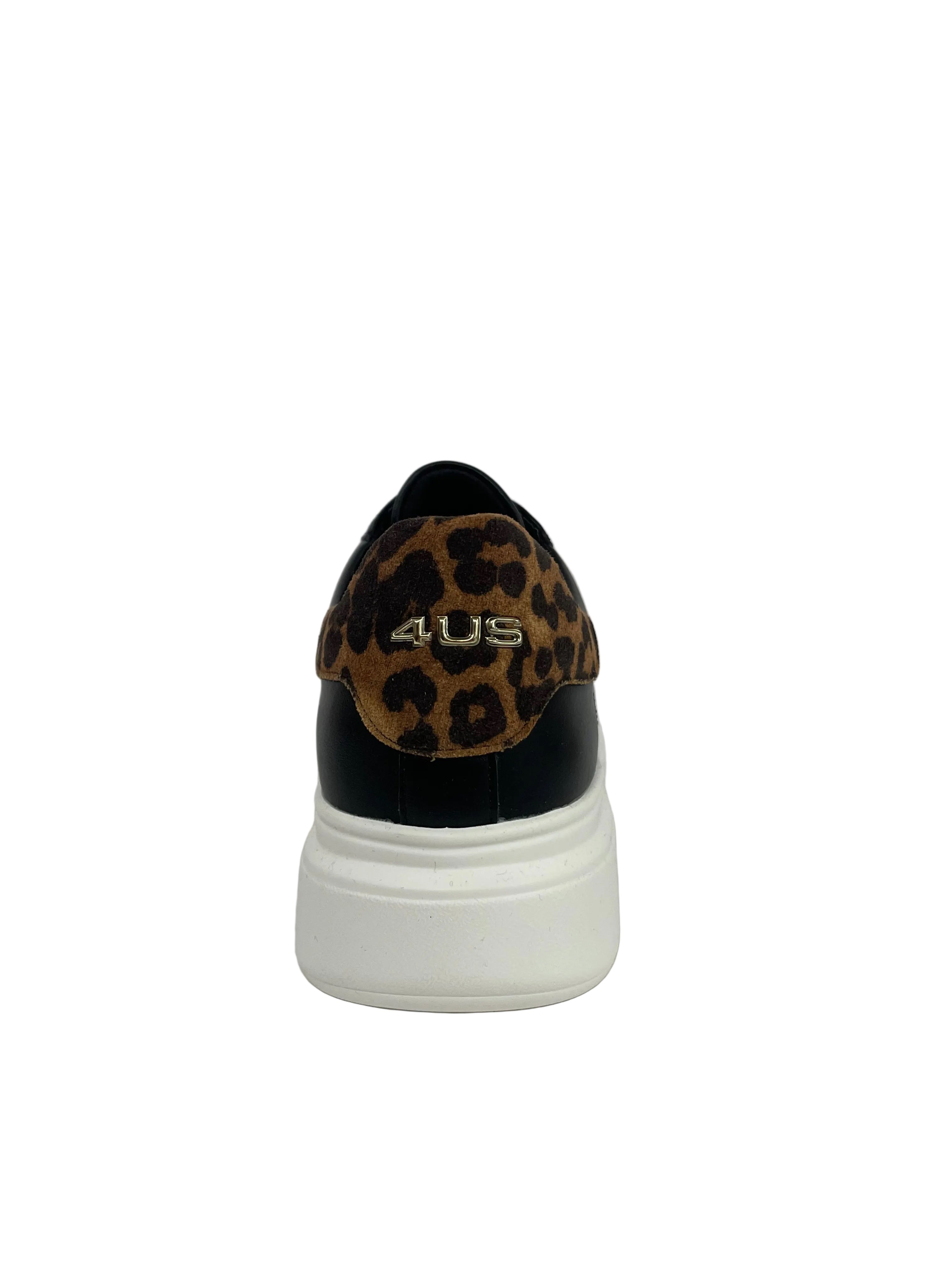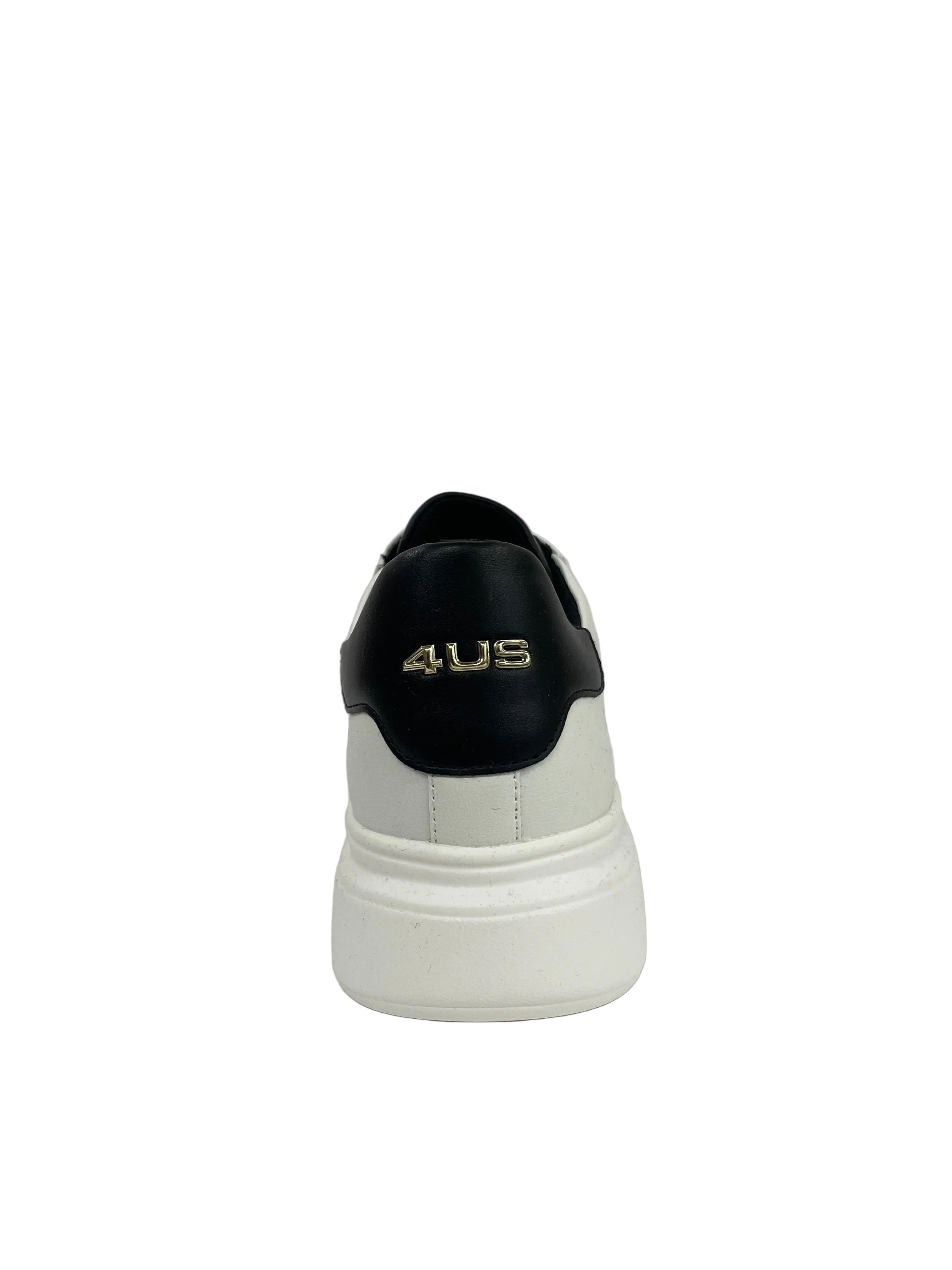 Queste sneaker 4US Cesare Paciotti fondono un'estetica urban con dettagli di lusso contemporaneo. Realizzate in pelle di alta qualità, le calzature sono definite da un'audace suola platform bianca e dall'iconico logo dorato "4US" applicato lateralmente. La collezione offre diverse declinazioni di stile attraverso i dettagli sul tallone: dalla versione in pelle nera con inserto lucido, a quella più grintosa con stampa leopardata, fino alla classica variante bianca con contrasti neri.