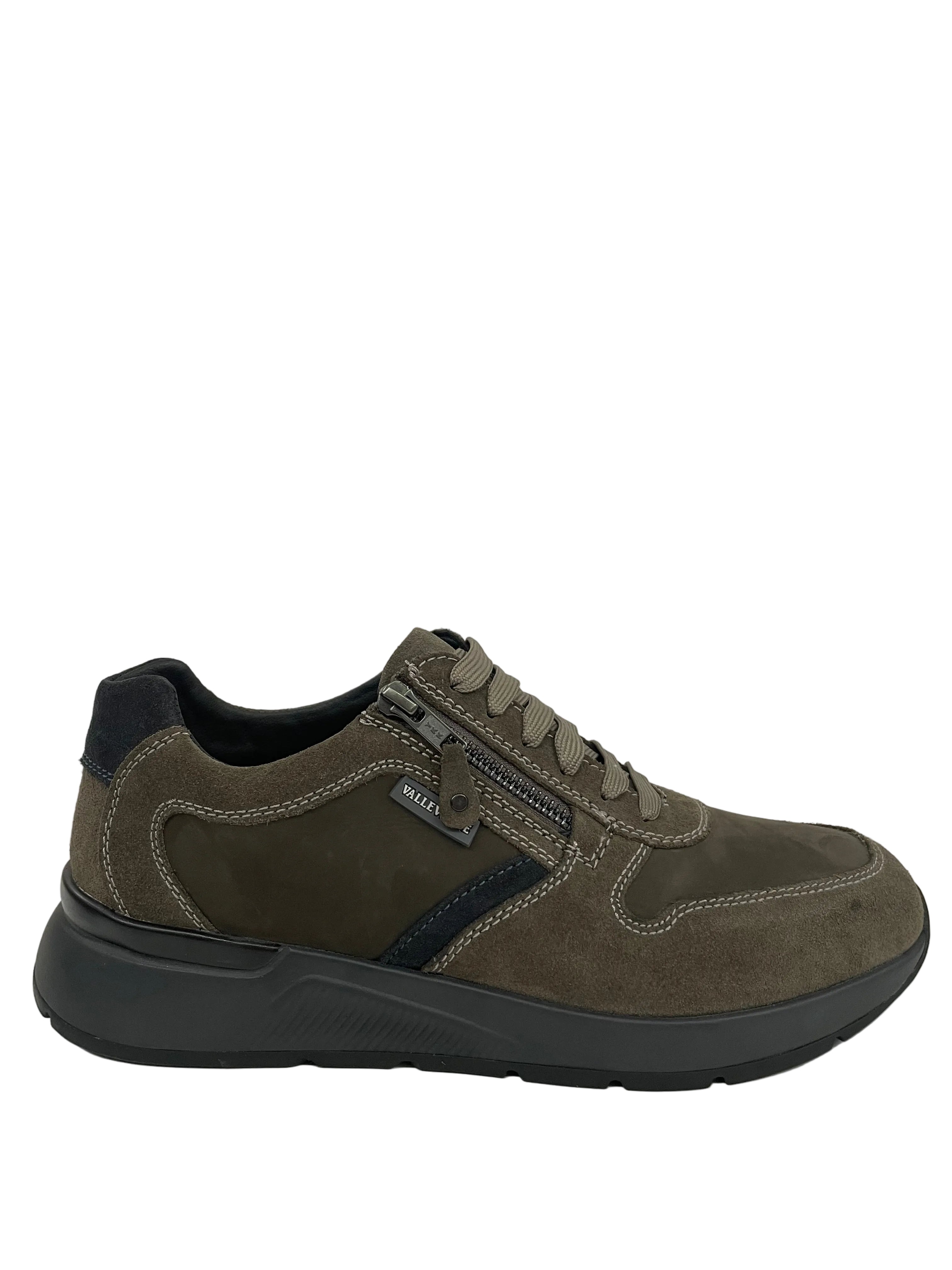 Scegli il comfort senza rinunciare allo stile con questa sneaker Valleverde. Realizzata in pelle scamosciata color fango con dettagli blu navy, unisce eleganza casual e praticità.