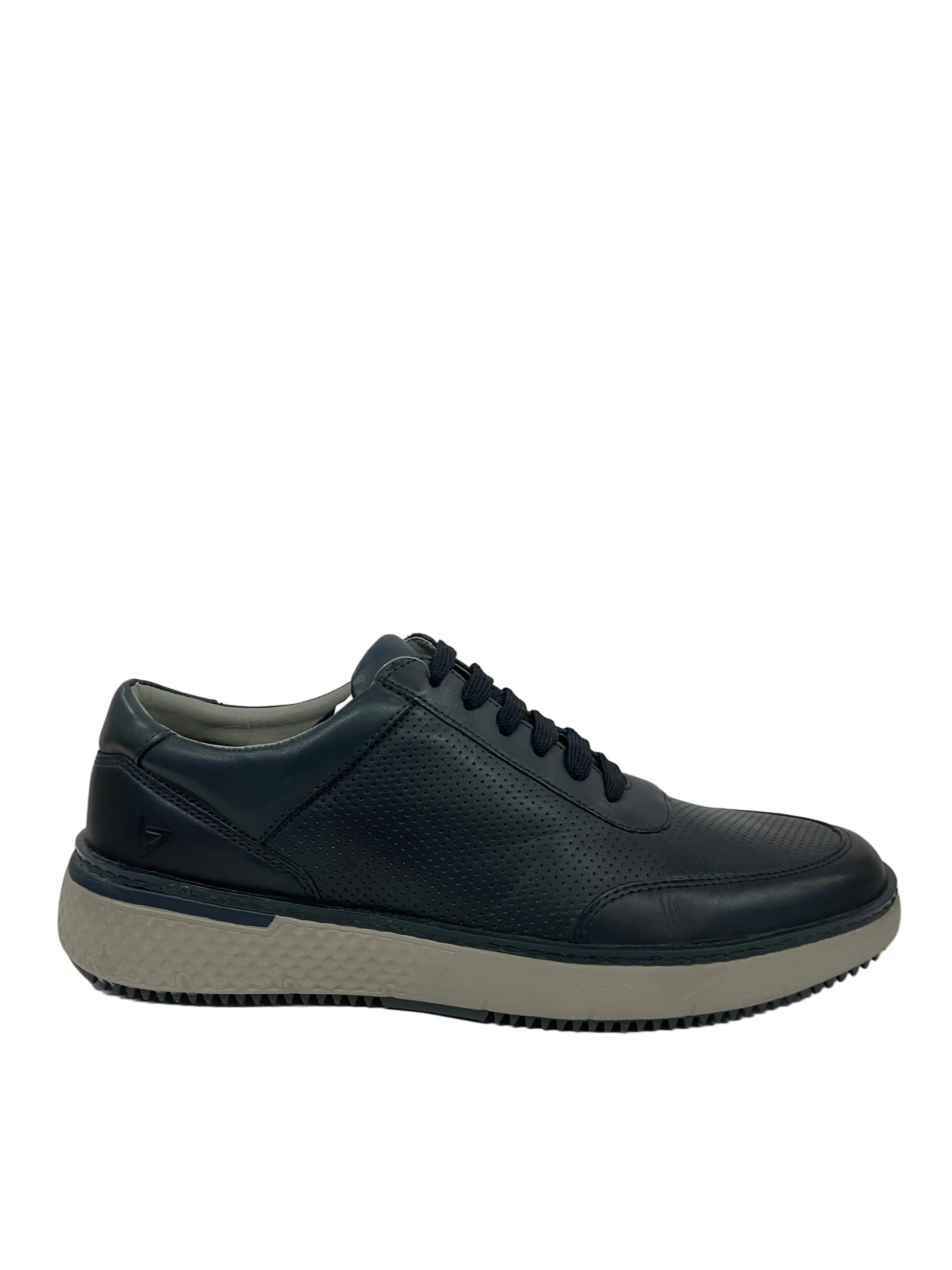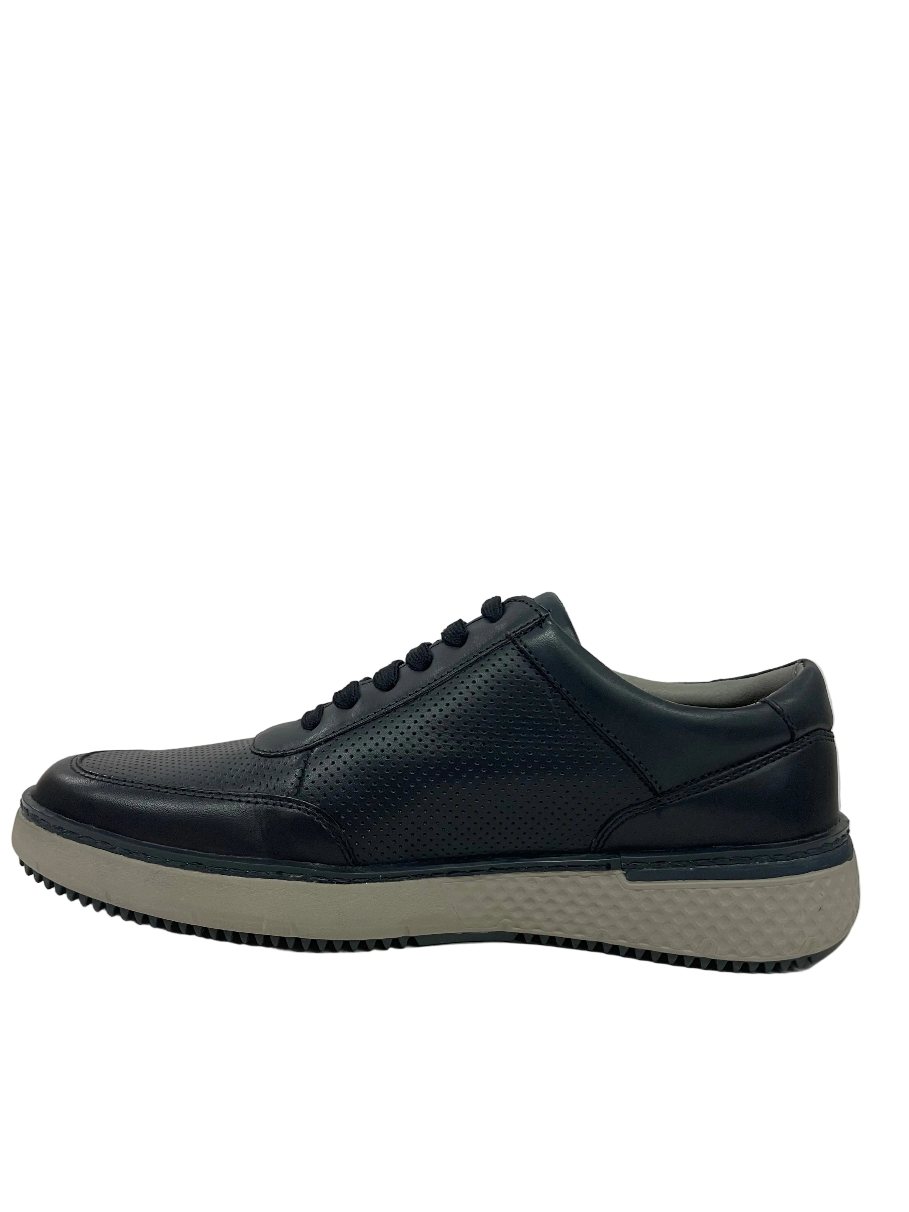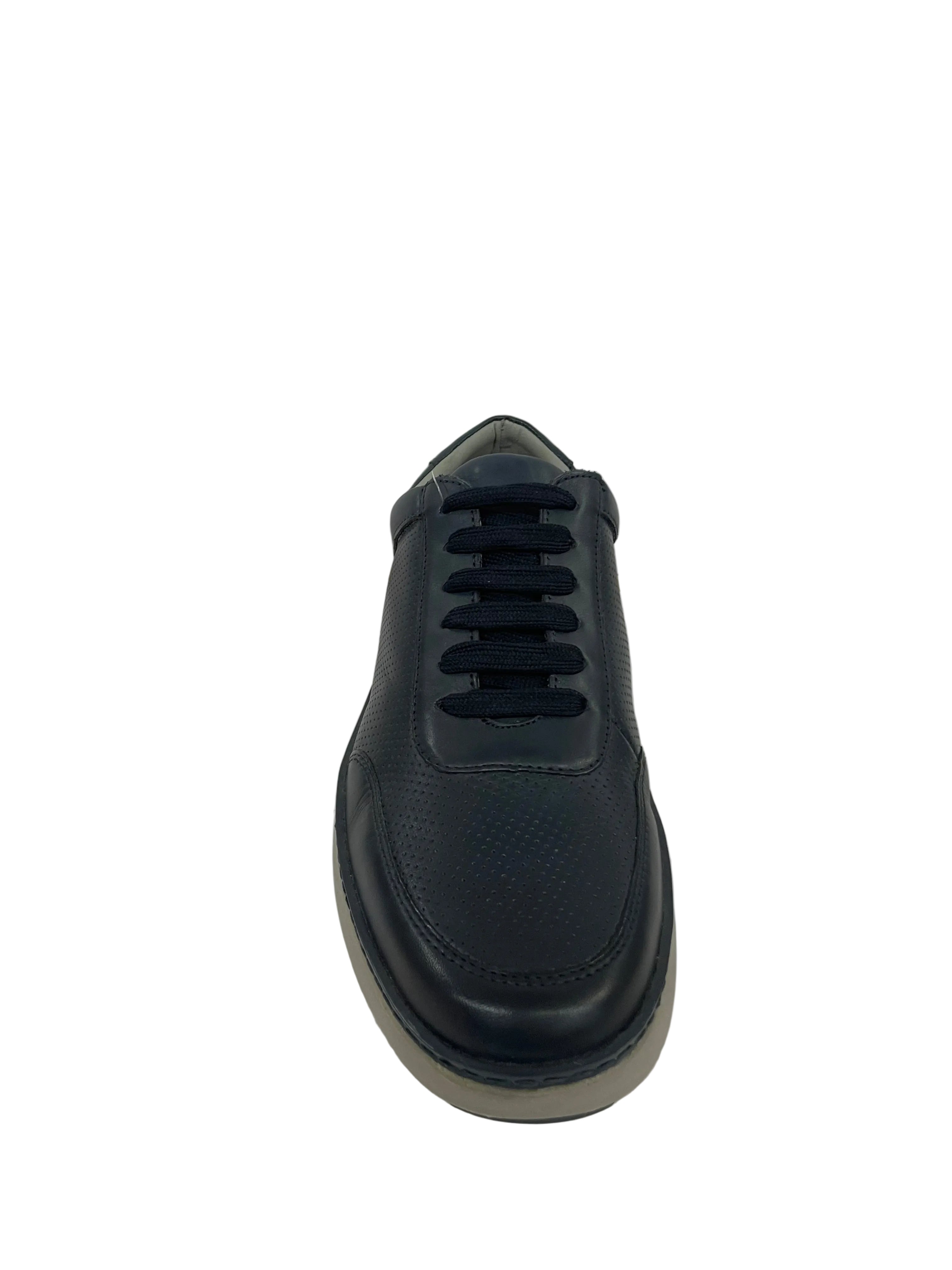 Sneaker Valleverde uomo in stile urban-casual, realizzata in morbida pelle blu scuro. Si distingue per la raffinata trama traforata sui lati e sulla punta, che favorisce la traspirazione, e per la suola in gomma grigio chiaro a contrasto con battistrada dentellato. Un modello leggero e versatile, perfetto per chi cerca eleganza e comfort quotidiano.