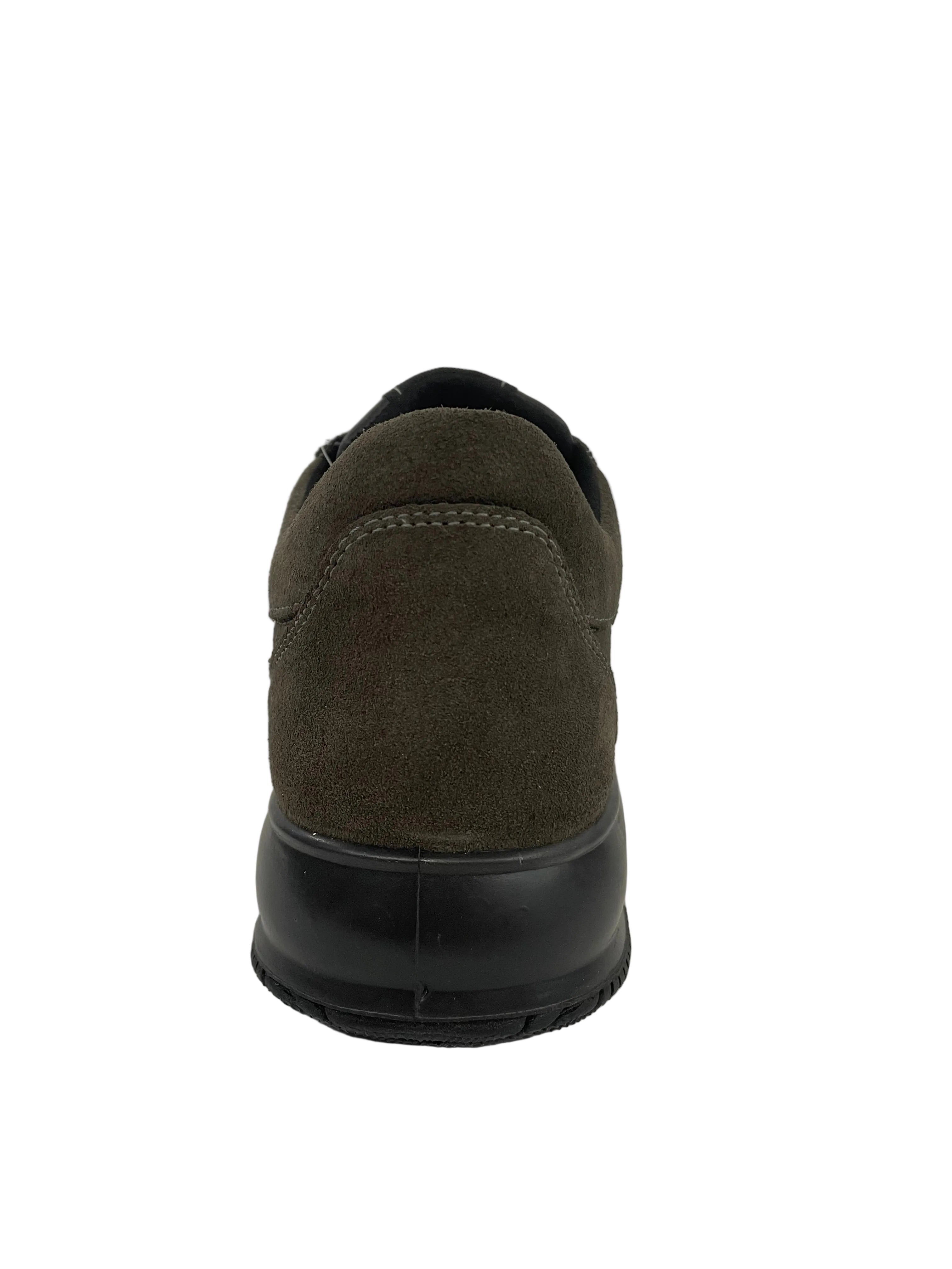 • Design e Materiali: Il modello si presenta come una scarpa stringata dal taglio sportivo ed elegante, realizzata in morbido nabuk o scamosciato in una raffinata tonalità fango/marrone scuro. Le cuciture a vista tono su tono ne sottolineano la cura artigianale.