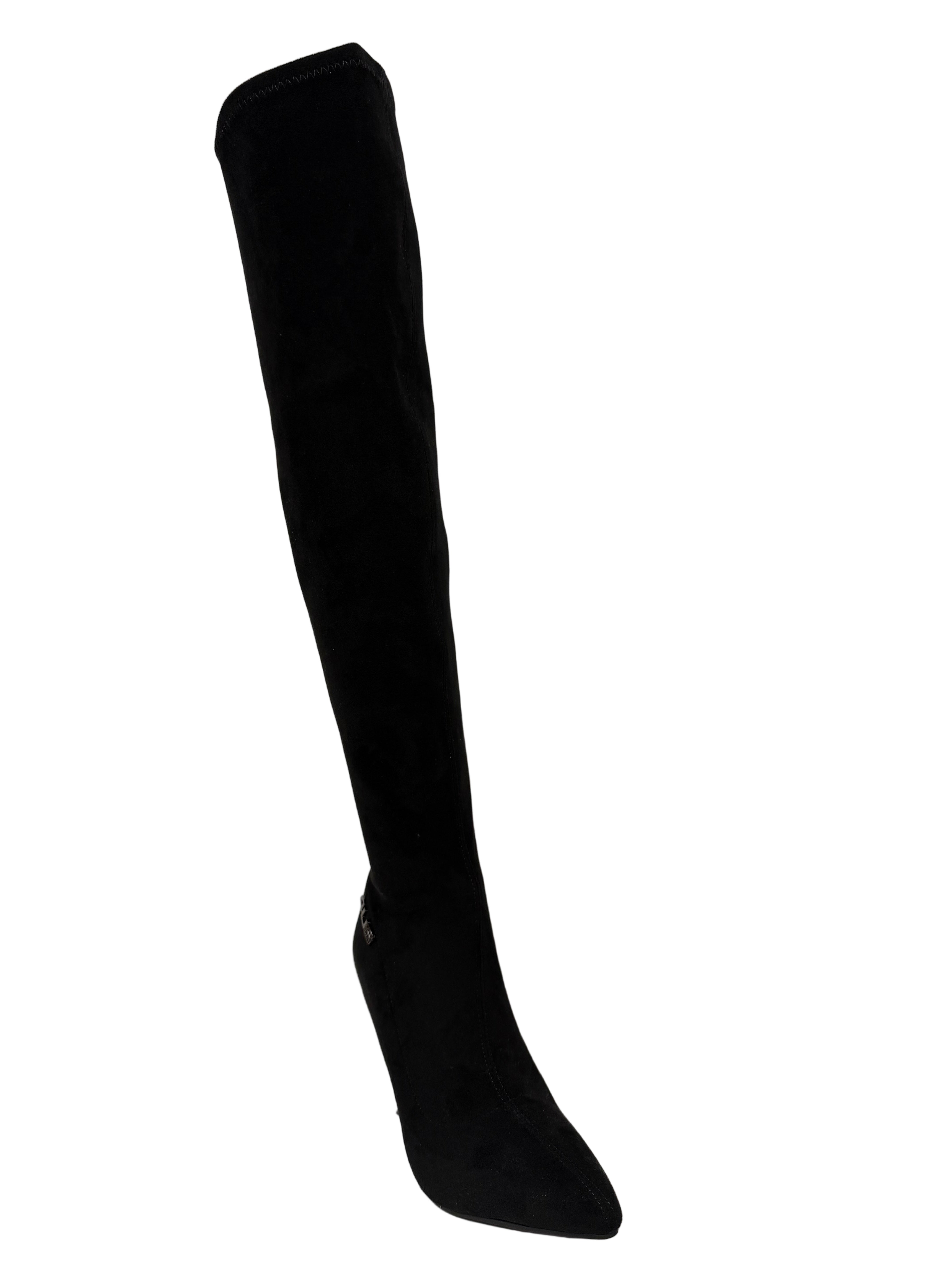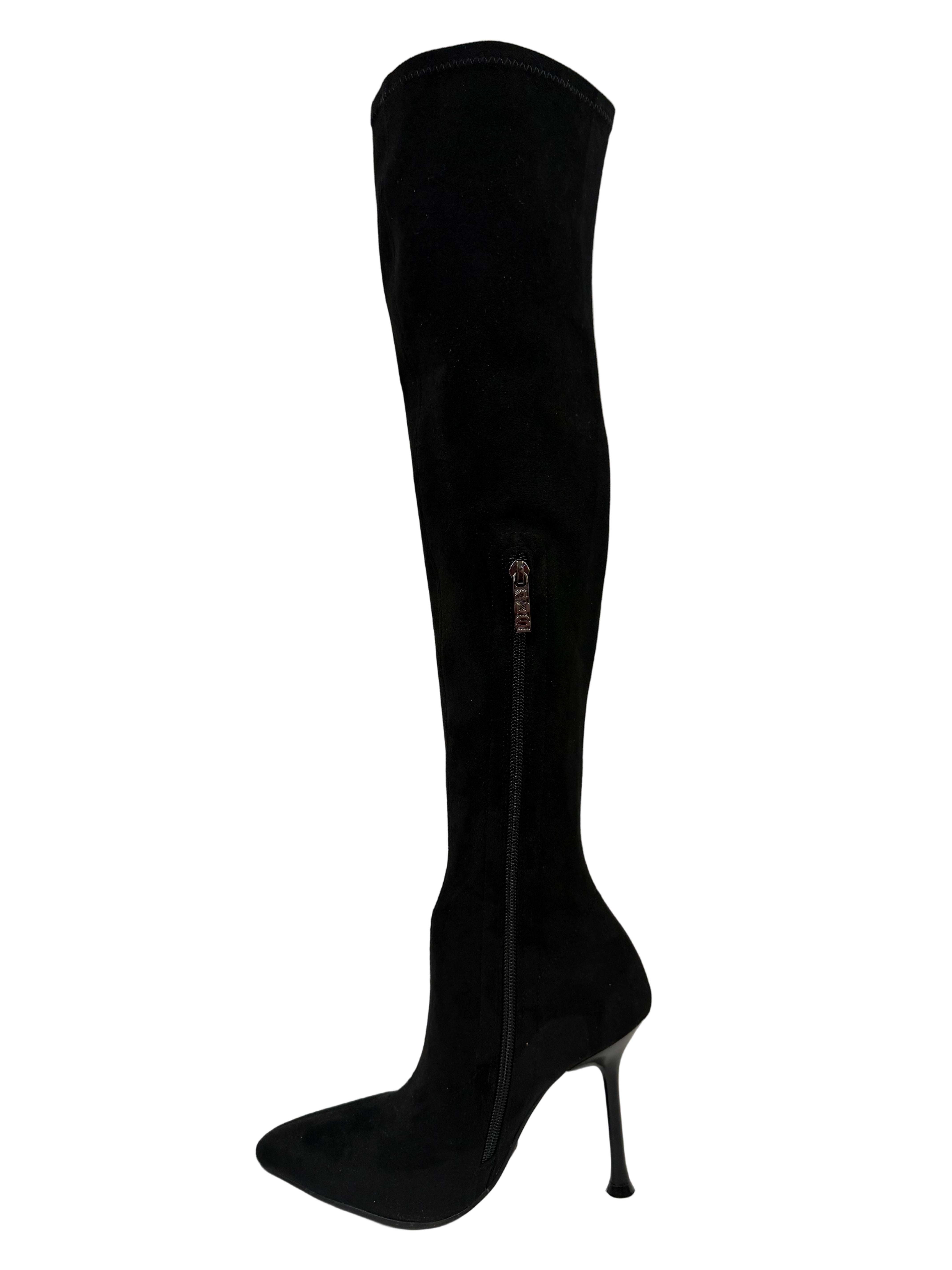 Design Affusolato: La silhouette avvolgente è realizzata in un lussuoso tessuto effetto scamosciato nero che abbraccia la gamba come una seconda pelle, garantendo una vestibilità slim e sofisticata.