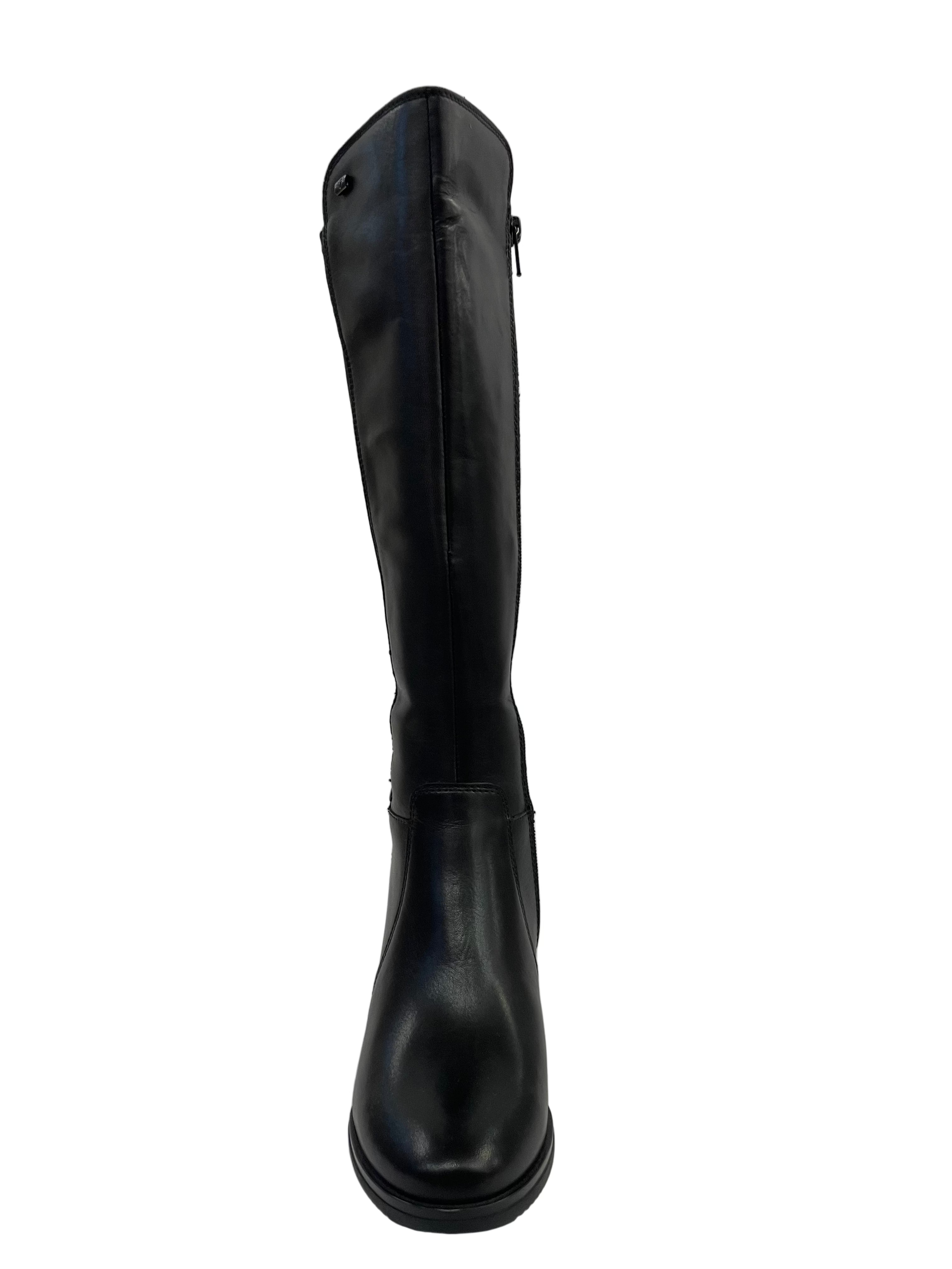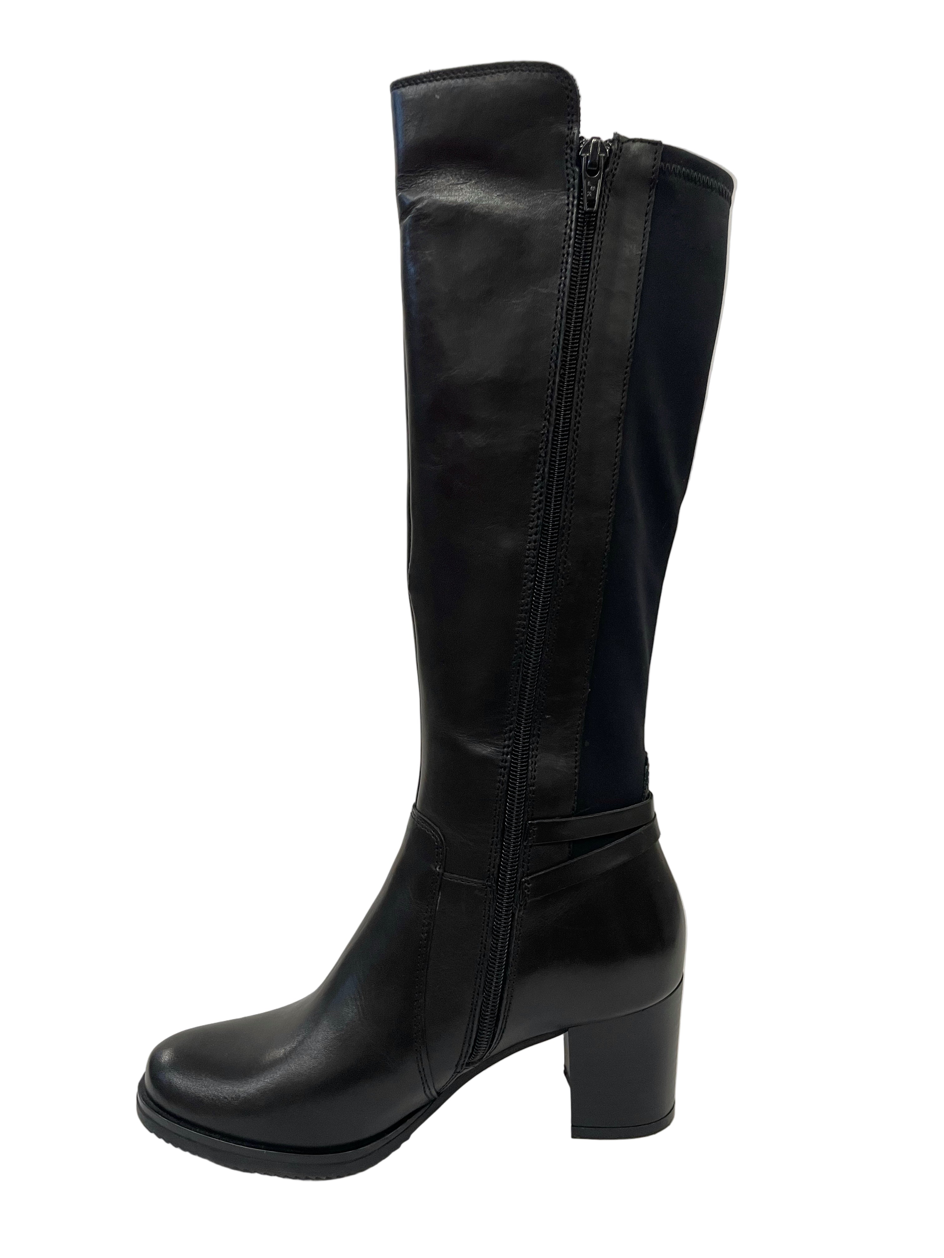Parte Posteriore: Gambale realizzato in tessuto stretch elasticizzato nero, che assicura una calzata aderente, comoda e adattabile a diverse circonferenze del polpaccio.