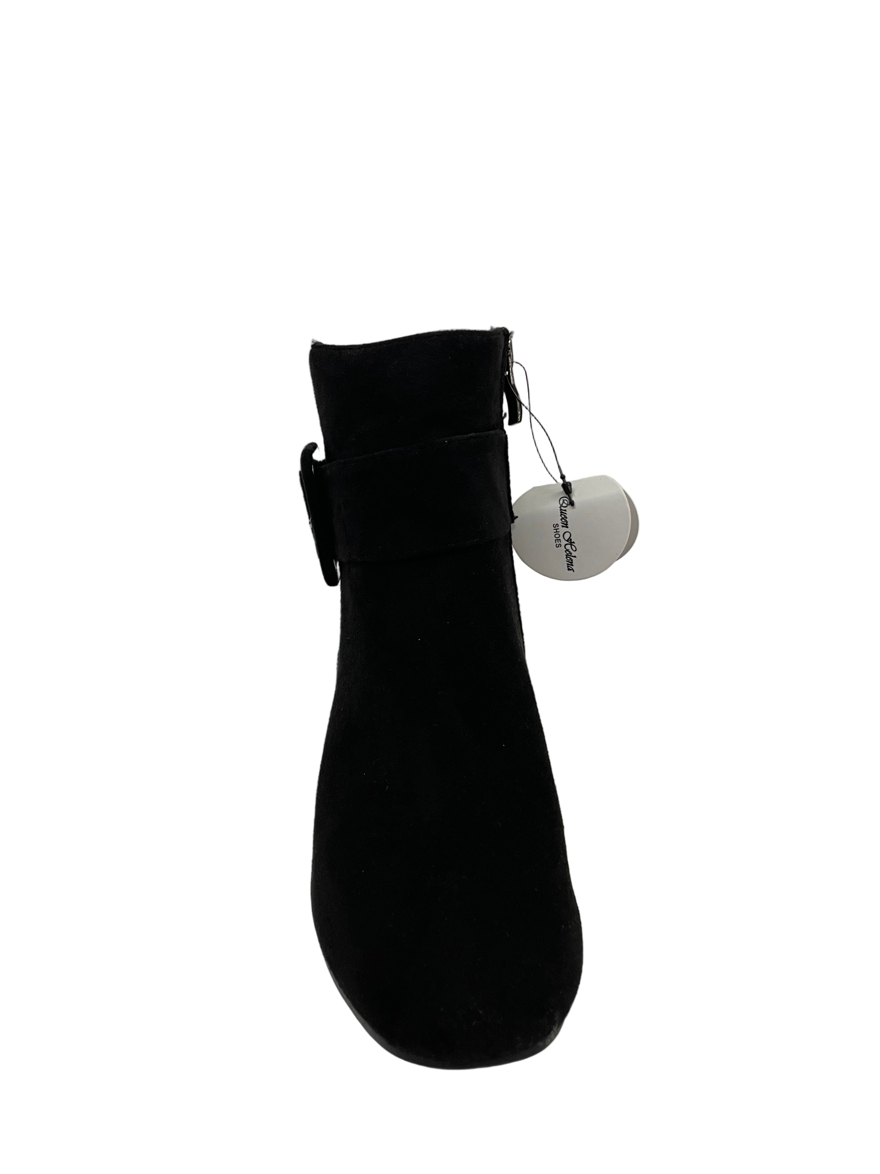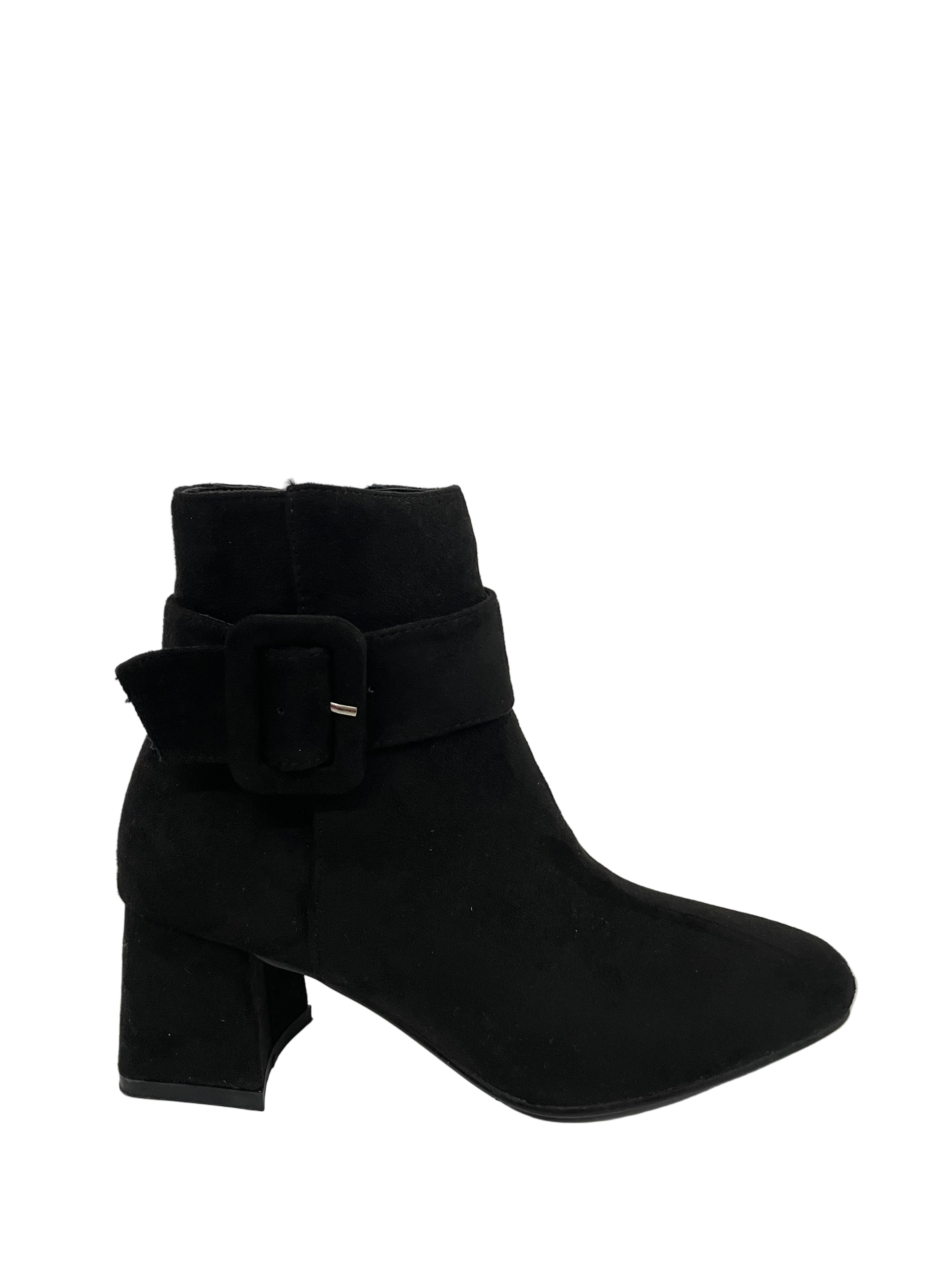 - Colore: Nero - Materiale: Ecopelle effetto camoscio - Altezza tacco: circa 6 cm- Chiusura laterale con zip - Dettaglio: Fibbia decorativa in tinta