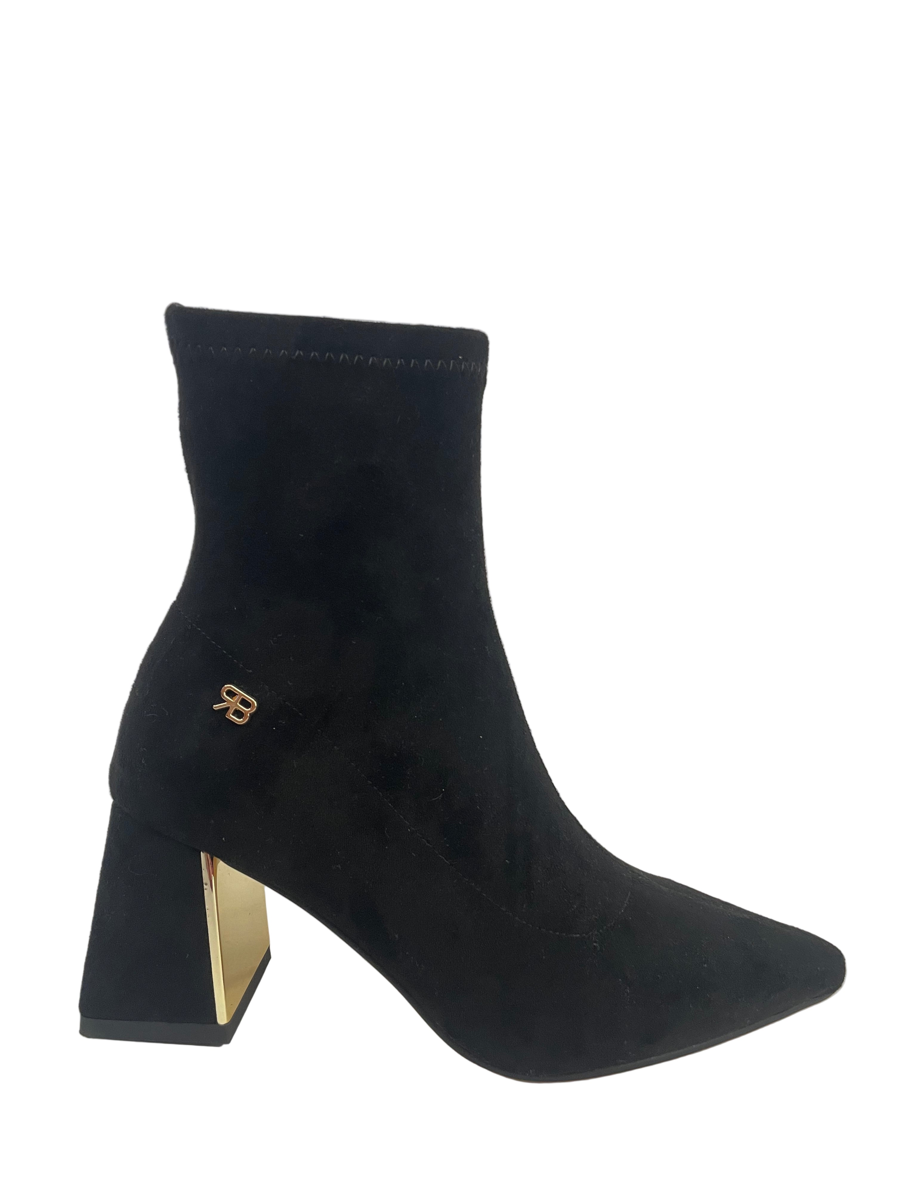 • ​Tacco largo e squadrato (Block Heel) con una distintiva placca metallica color oro sul lato interno/posteriore, che cattura la luce ad ogni passo.
