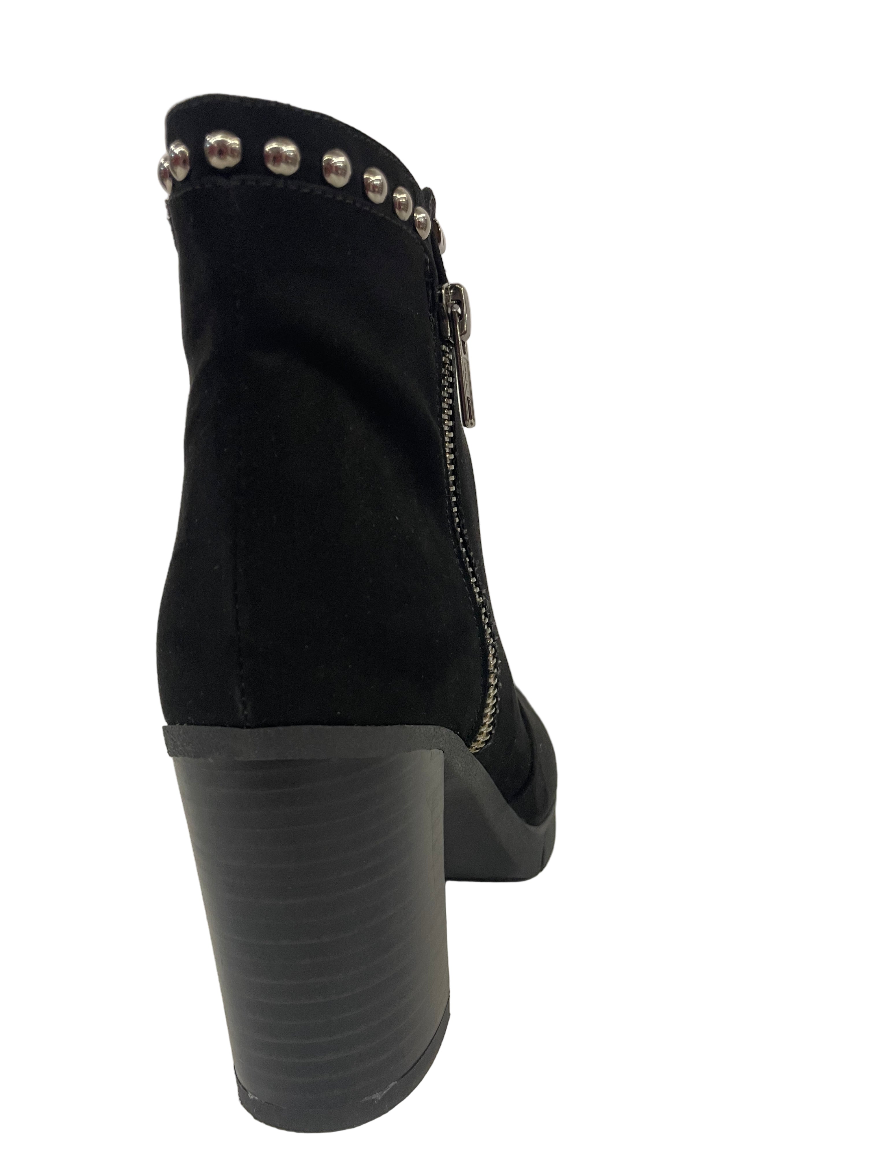 • Porta il tuo look a un nuovo livello con questo stivaletto Valleverde dal design deciso. In camoscio nero profondo, è arricchito da eleganti borchie e una vistosa zip decorativa. Il tacco di 8.5cm e la suola platform creano una silhouette slanciata, mentre la cerniera interna funzionale ne rende la calzata un gioco da ragazzi. Perfetto per un tocco rock-chic ai tuoi outfit.